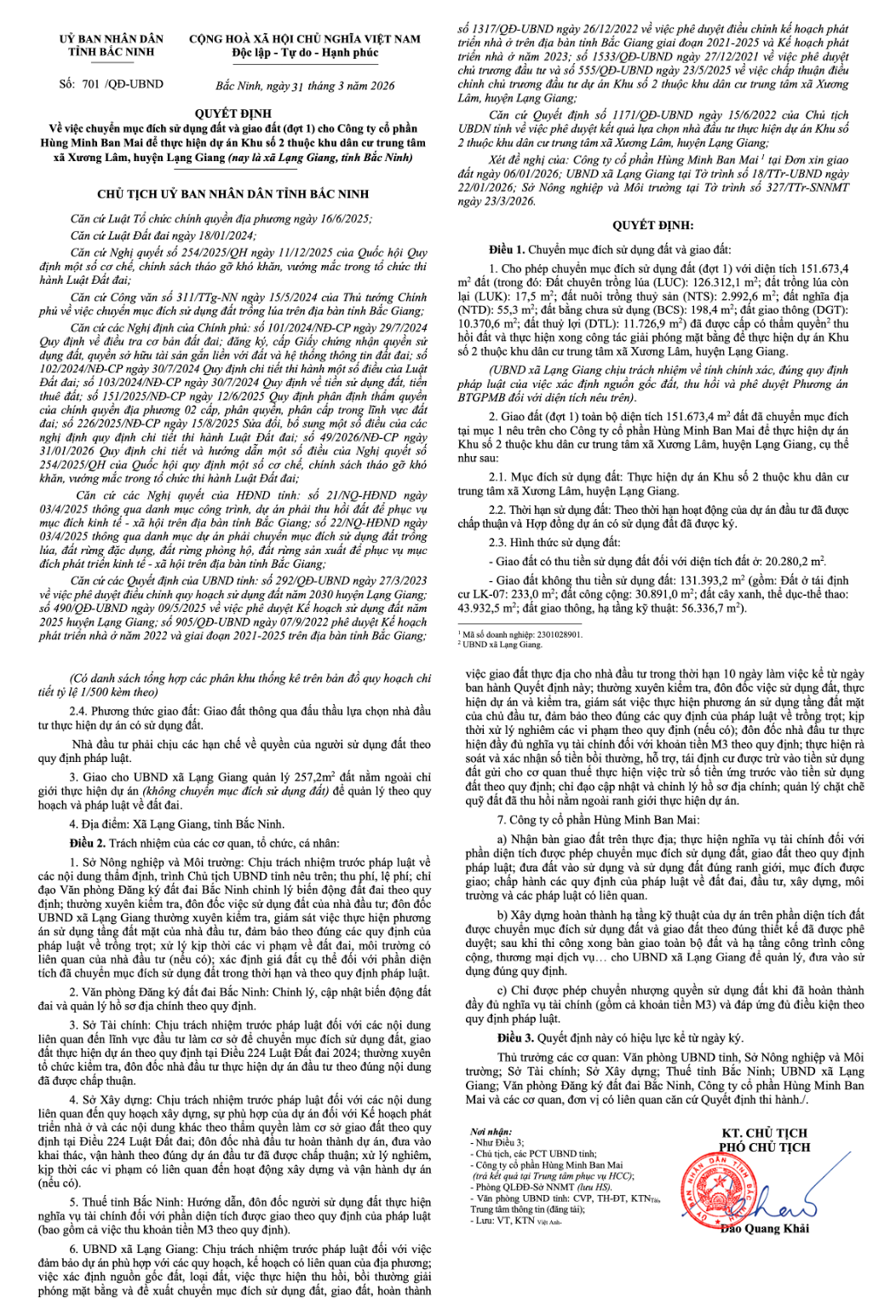 Quyết định số 701/QĐ-UBND do Phó Chủ tịch UBND tỉnh Bắc Ninh Đào Quang Khai ký ngày 31/03/2026.