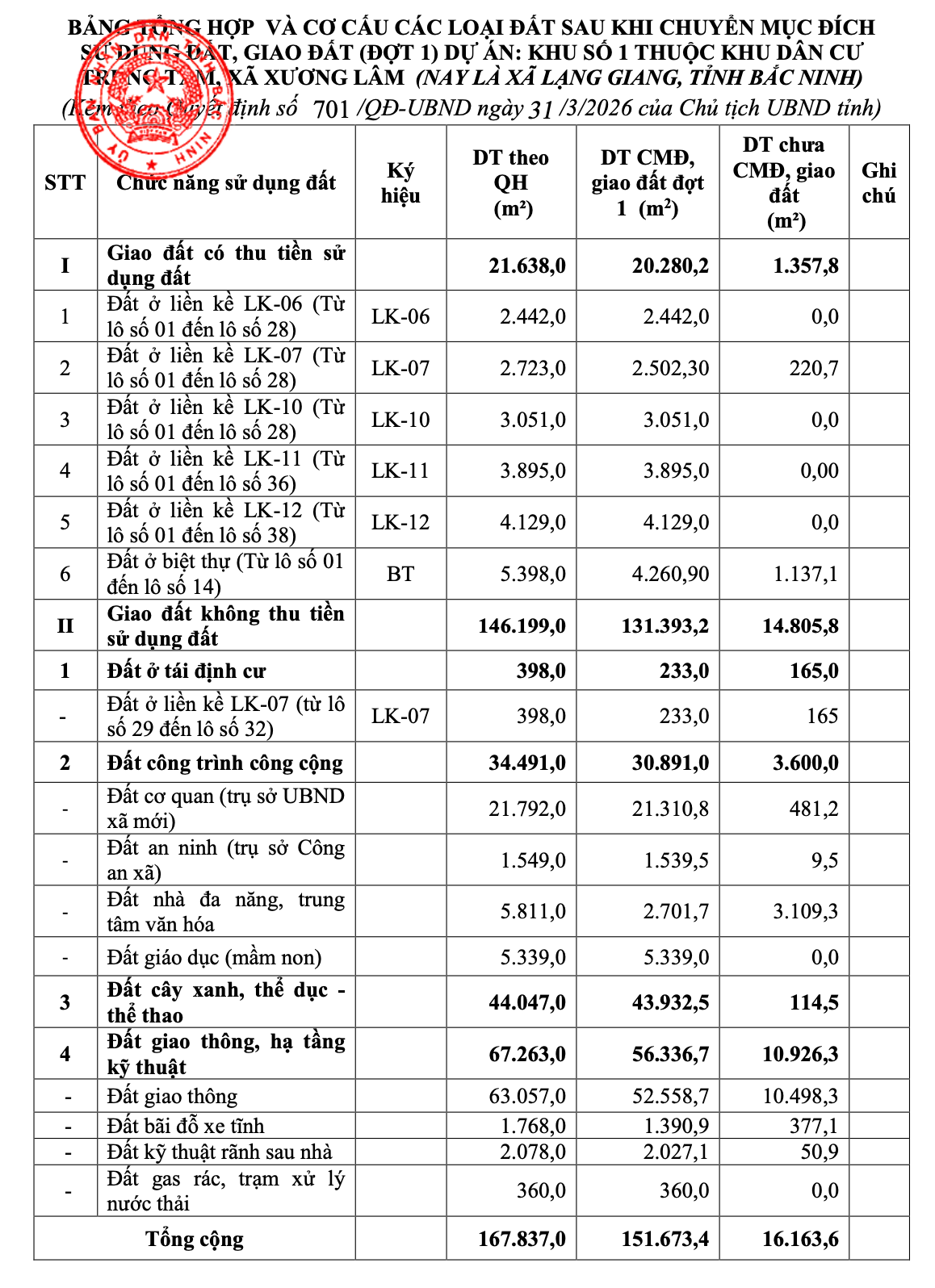 Bảng tổng hợp và cơ cấu các loại đất sau khi chuyển mục đích sử dụng đất kèm theo Quyết định số 701/QĐ-UBND của UBND tỉnh Bắc Ninh.