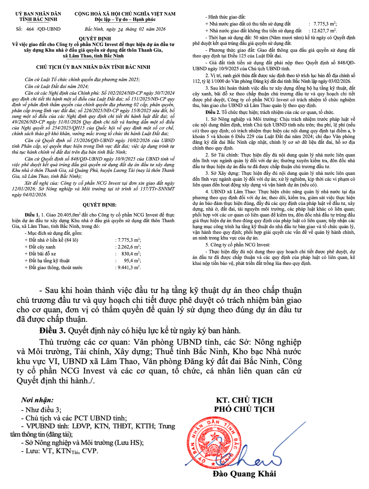 Quyết định số 464/QĐ-UBND do Phó Chủ tịch UBND tỉnh Bắc Ninh Đào Quang Khải ký ngày 24/02/2026.