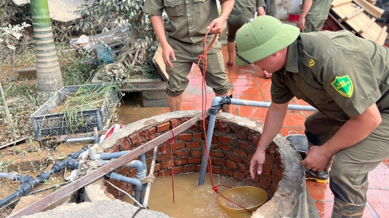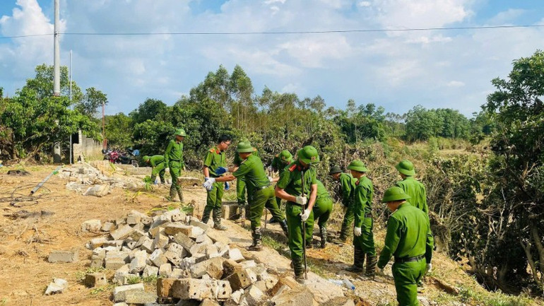Lực lượng công an hỗ trợ người dân khắc phục hậu quả sau lũ.