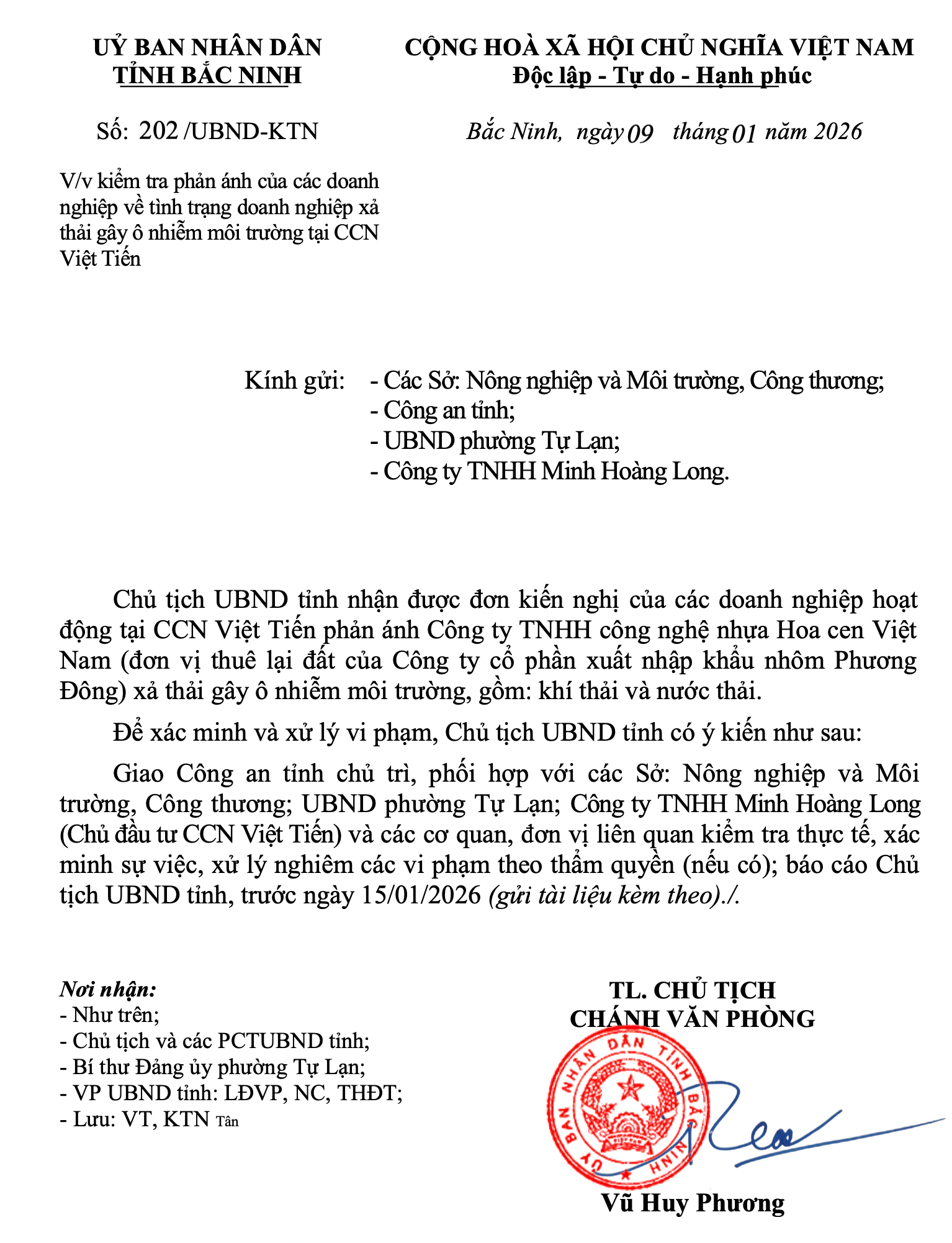 Theo đó, UBND tỉnh Bắc Ninh có văn bản số 202/UBND-KTN do Chánh Văn phòng UBND tỉnh Vũ Huy Phương ký ngày 09/01/2026. Theo văn bản, Chủ tịch UBND tỉnh Bắc Ninh đã nhận được đơn kiến nghị của các doanh nghiệp đang hoạt động tại Cụm công nghiệp (CCN) Việt Tiến phản ánh về việc Công ty TNHH công nghệ nhựa Hoa Cen Việt Nam (đơn vị thuê lại đất của Công ty cổ phần xuất nhập khẩu nhôm Phương Đông) có hành vi xả thải gây ô nhiễm môi trường, bao gồm khí thải và nước thải.