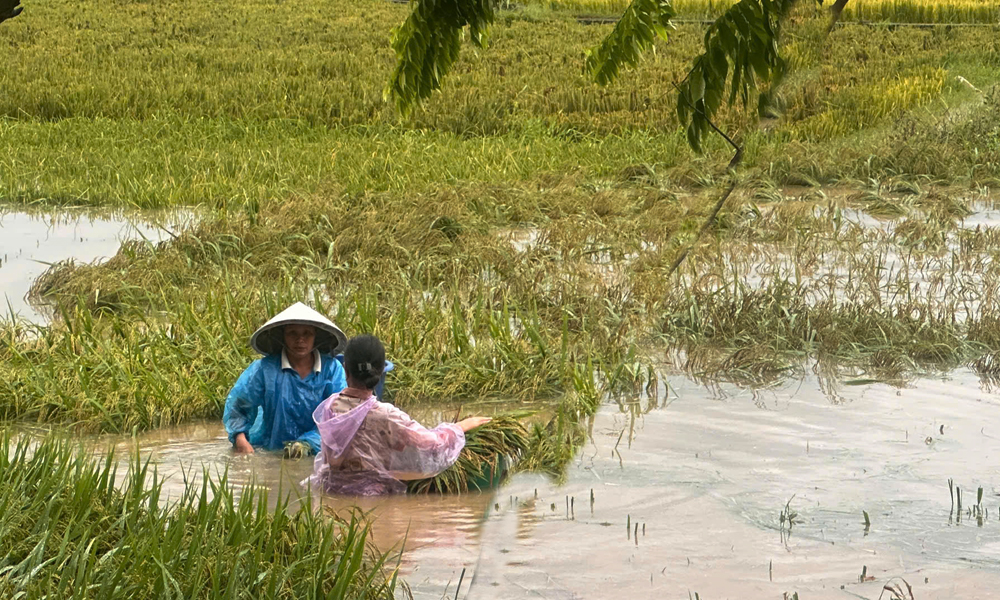 Nhân dân xã Xuân Cẩm khẩn trương thu hoạch lúa mùa trước khi lũ tràn về.