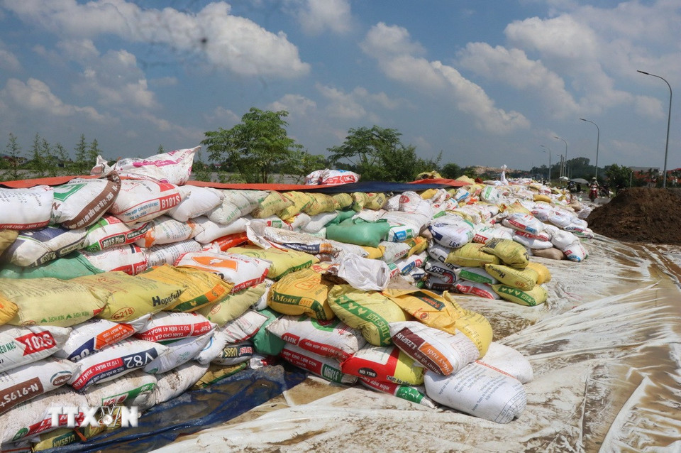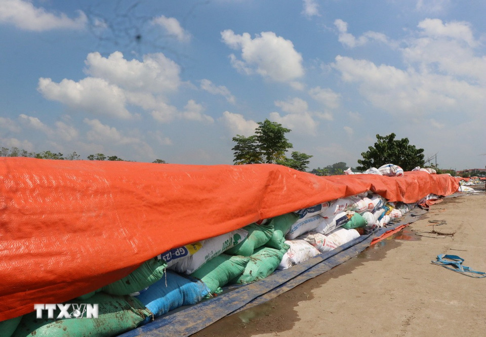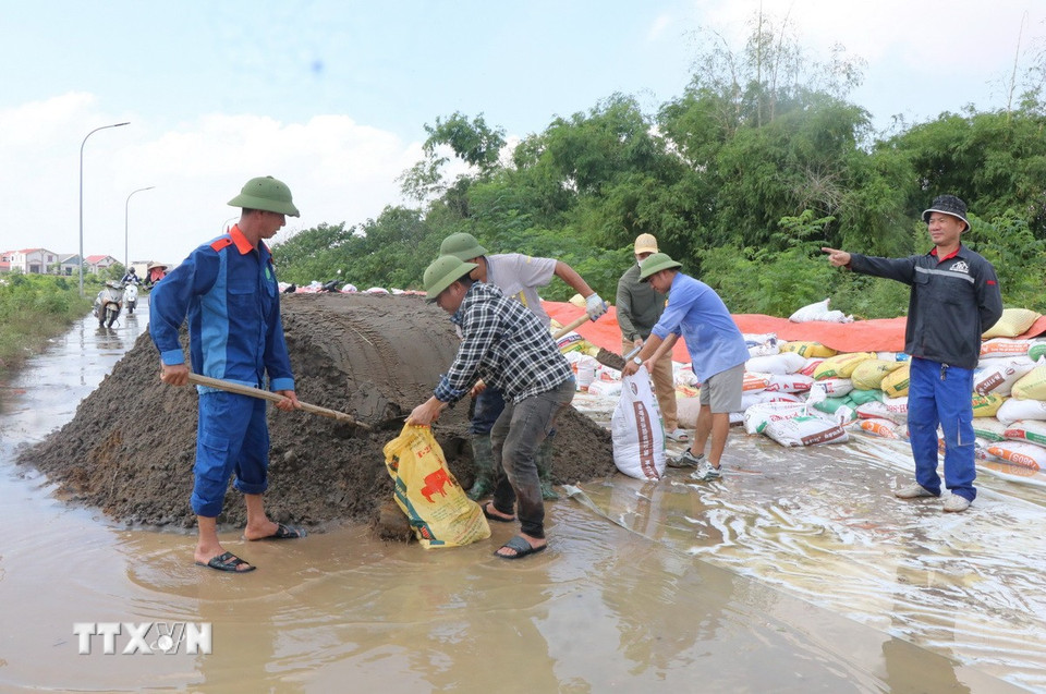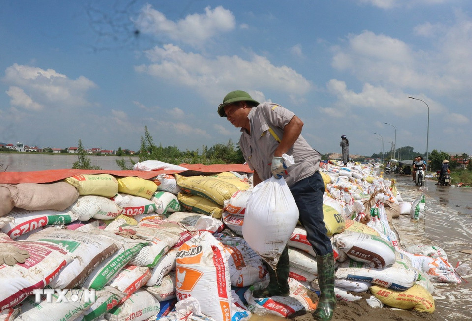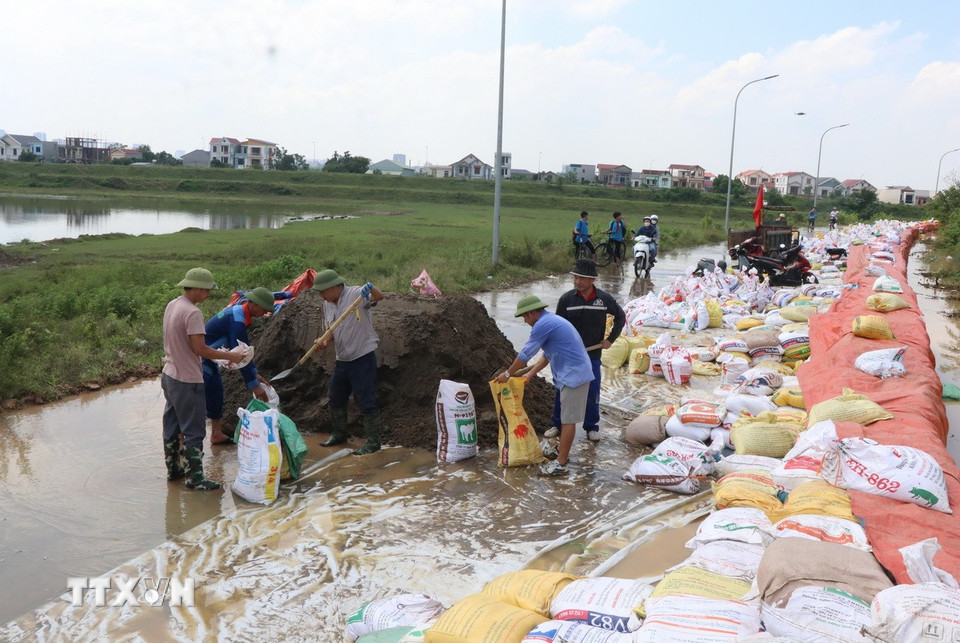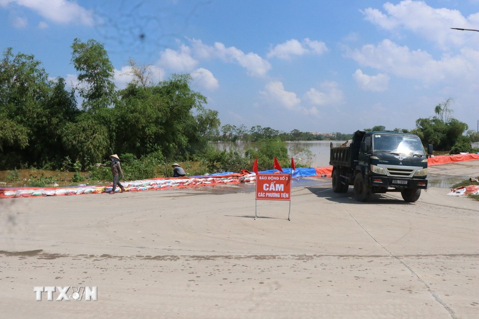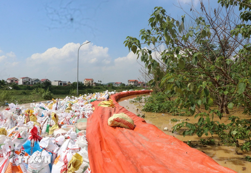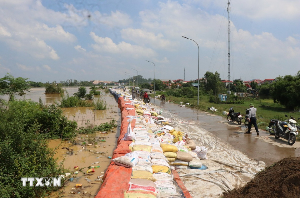 Dự kiến lũ sông Cầu tại khu vực này đạt đỉnh tối 9/10, các cấp chính quyền và người dân đang nỗ lực “cứu đê,” bảo vệ an toàn tính mạng, tài sản của nhân dân. (Ảnh: Thanh Thương/TTXVN)