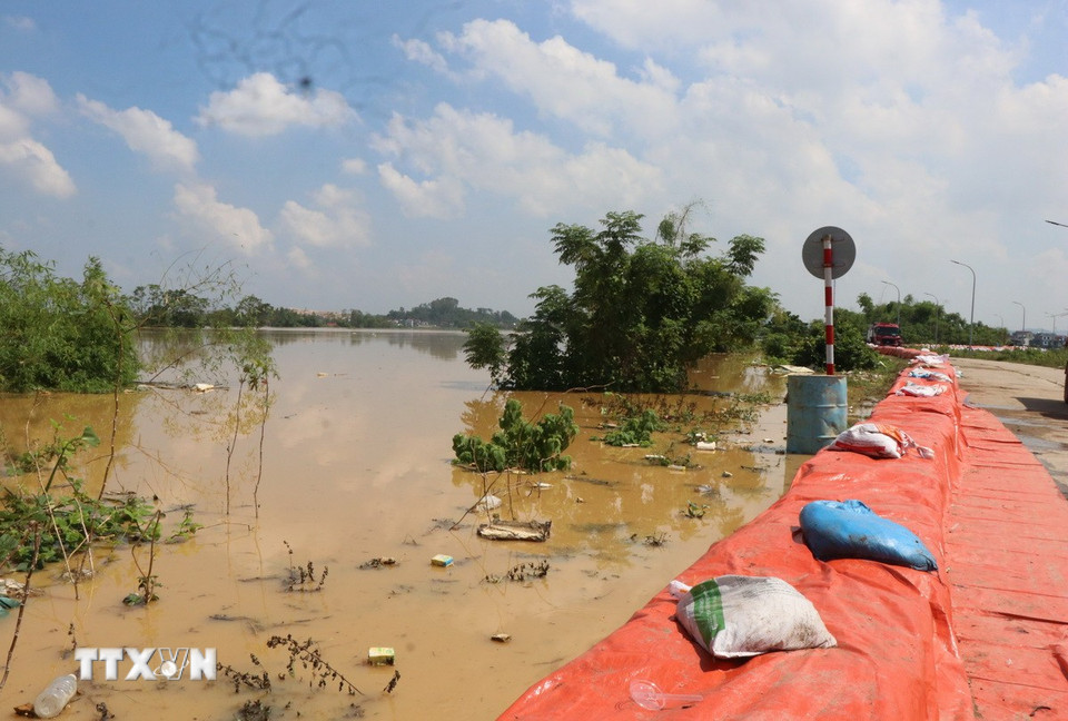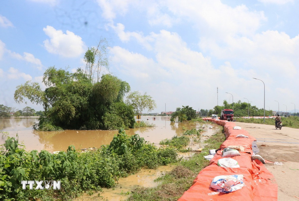 Tại trạm Phúc Lộc Phương, lũ đạt 9,79m, trên mức báo động 3 là 1,79m; tại Đáp Cầu lũ đạt 7,36m, trên báo động 3 là 1,06. (Ảnh: Thanh Thương/TTXVN)