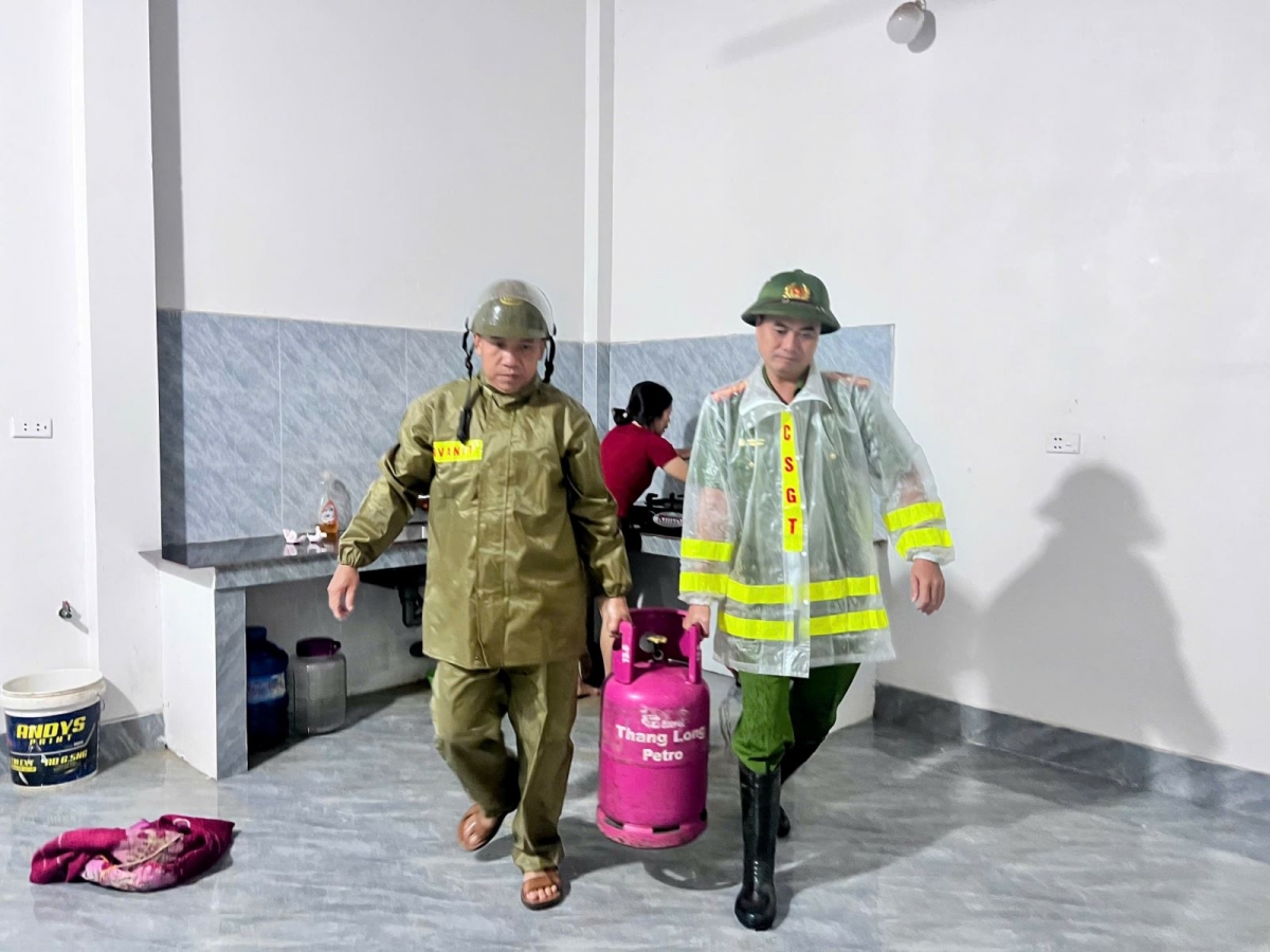Công an xã Sơn Động hỗ trợ di dời tài sản, bảo đảm an toàn cho người dân. (Ảnh: CACC)
