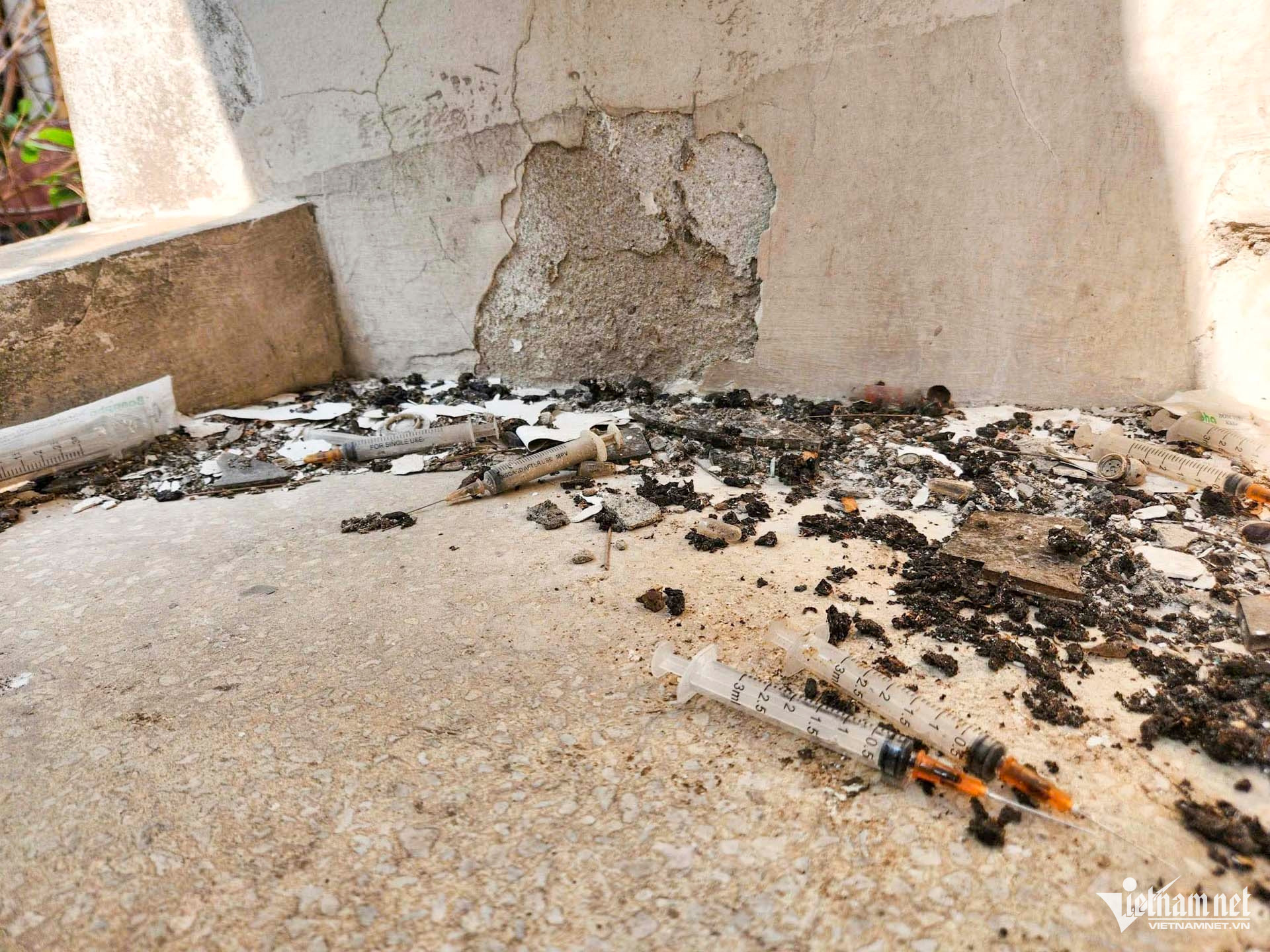 Hàng chục ống kim tiêm còn dính máu vứt khắp cầu thang trong trụ sở bỏ hoang, tiềm ẩn nguy cơ mất an toàn. Ảnh: V.H