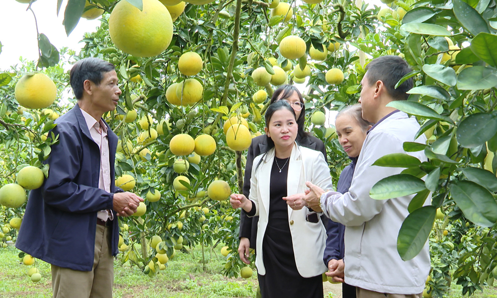 Lãnh đạo Chi cục Trồng trọt và Bảo vệ thực vật đưa khách tới thăm mô hình trồng bưởi ngọt theo tiêu chuẩn VietGAP của gia đình ông Trần Đình Én (ngoài cùng bên trái), tổ dân phố Tân Trường, phường Chũ.