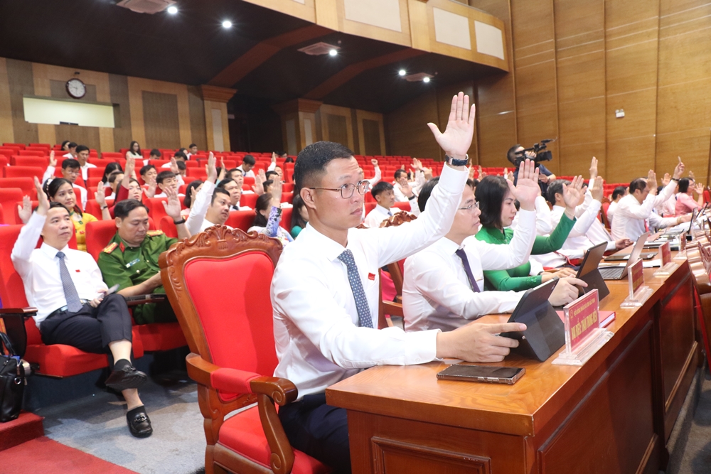 Các đại biểu HĐND tỉnh Bắc Ninh biểu quyết thông qua các nghị quyết tại kỳ họp thứ hai, khóa XIX, nhiệm kỳ 2021-2026.