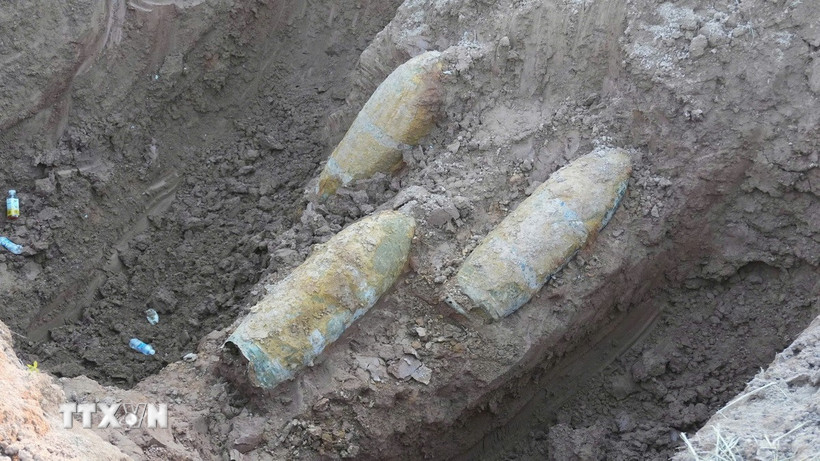 Hiện trường phát hiện ba quả bom. (Ảnh: TTXVN phát)