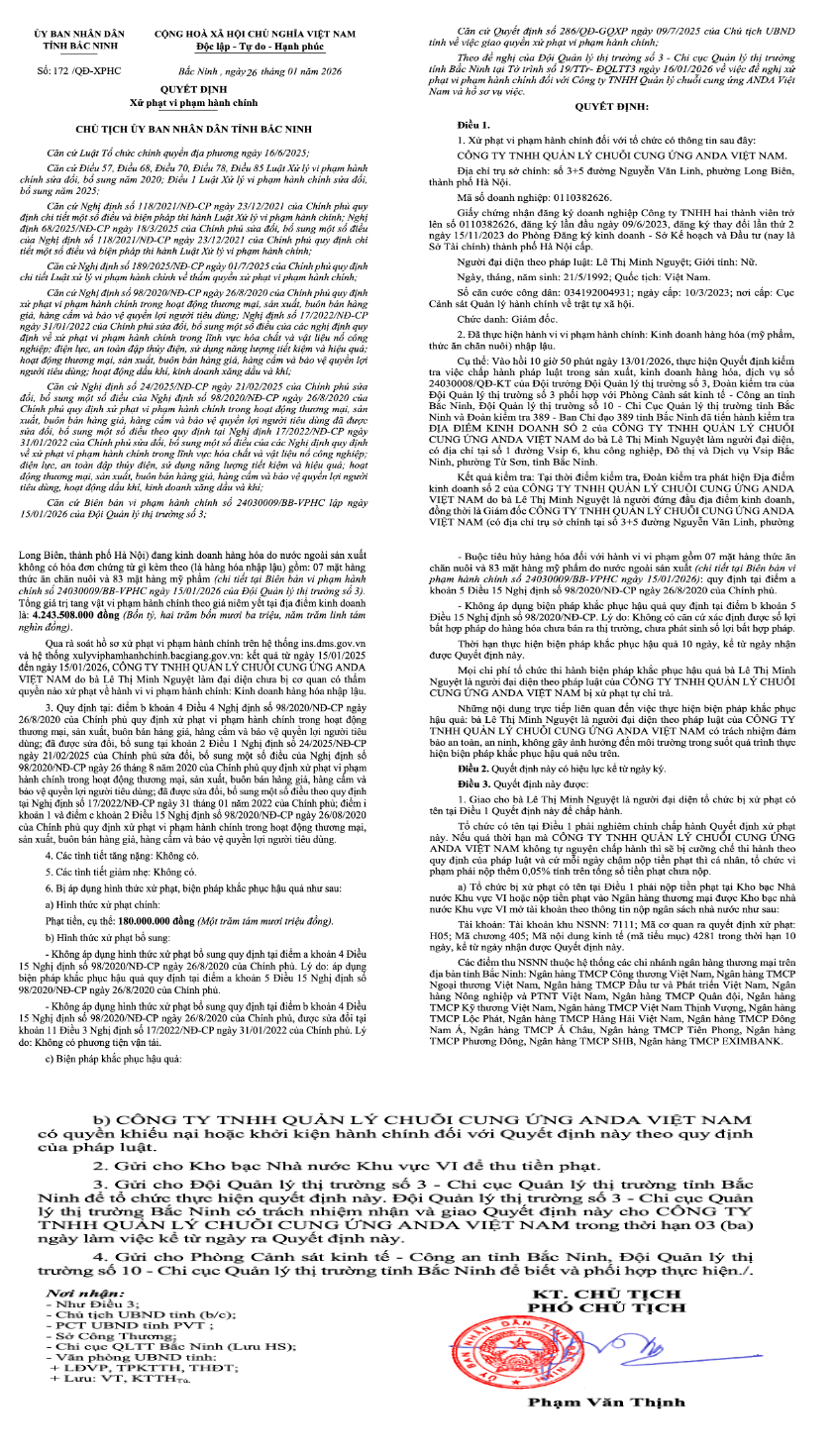 Căn cứ các quy định của pháp luật về xử phạt vi phạm hành chính trong lĩnh vực thương mại, Chủ tịch UBND tỉnh Bắc Ninh đã quyết định xử phạt Công ty ANDA Việt Nam số tiền 180 triệu đồng.