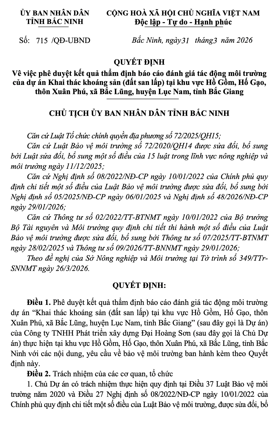 Quyết định số 715/QĐ-UBND do Phó Chủ tịch UBND tỉnh Bắc Ninh Đào Quang Khải ký ngày 31/03/2026.