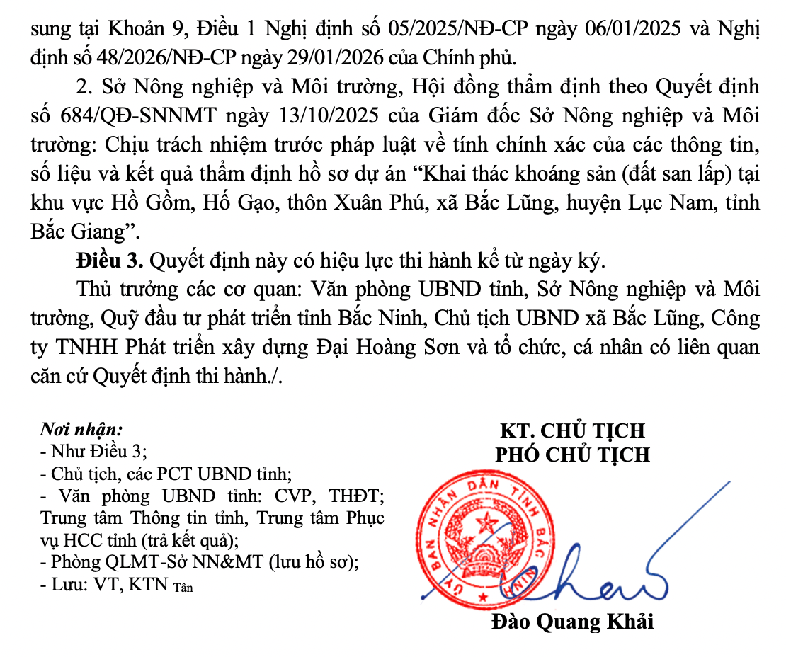 Theo quyết định, dự án do Công ty TNHH Phát triển xây dựng Đại Hoàng Sơn làm chủ đầu tư, thực hiện tại khu vực Hồ Gồm, Hố Gạo, thôn Xuân Phú, xã Bắc Lũng, tỉnh Bắc Ninh.