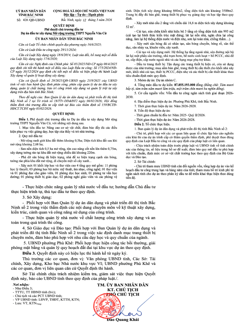 Quyết định số 428/QĐ-UBND do Phó Chủ tịch UBND tỉnh Bắc Ninh Đào Quang Khải ký ngày 12/03/2026.