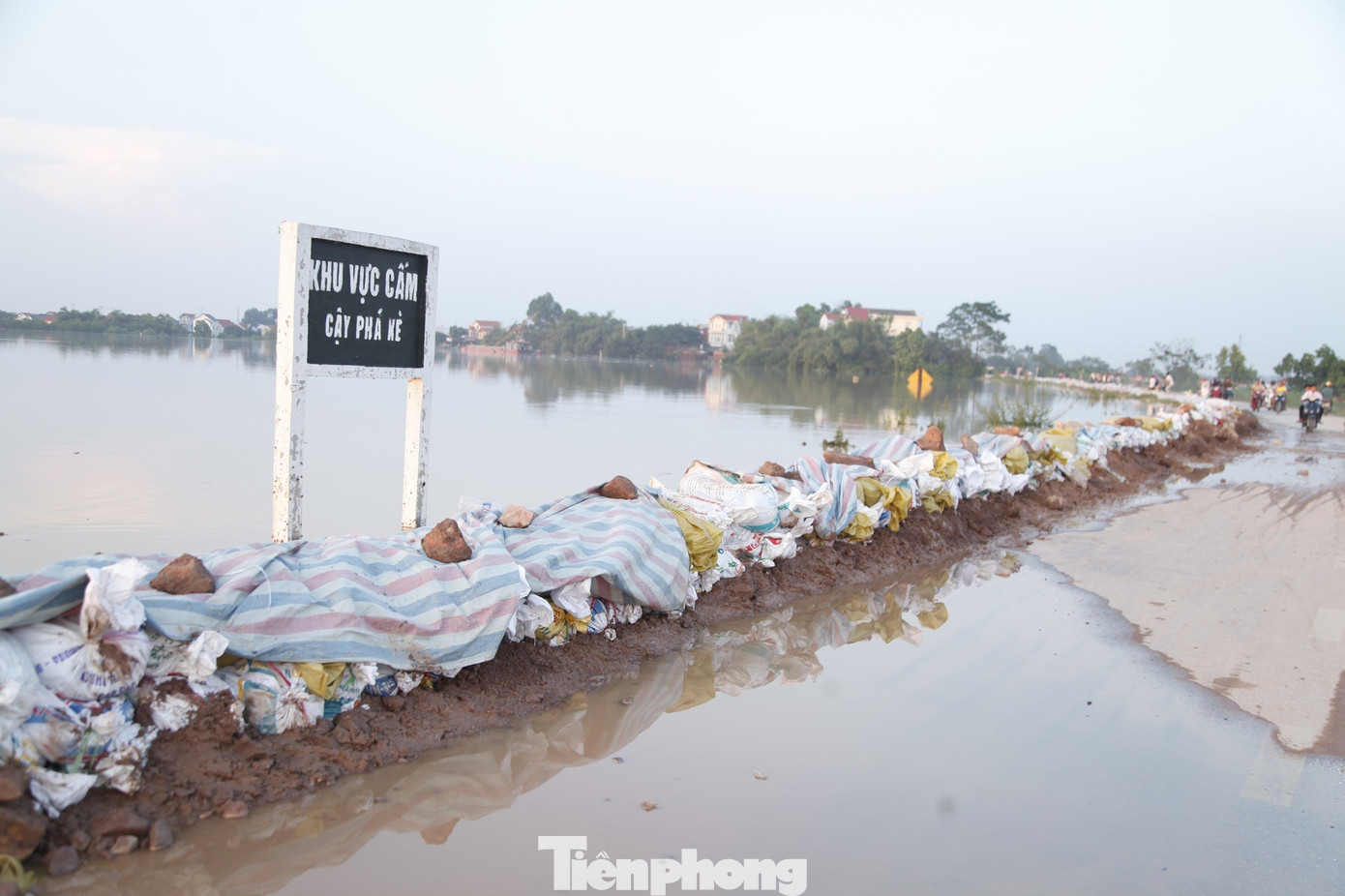 Gia cố đê sông Cầu thuộc địa phận xã Xuân Cẩm do nước lũ dâng cao. Ảnh: Nguyễn Thắng