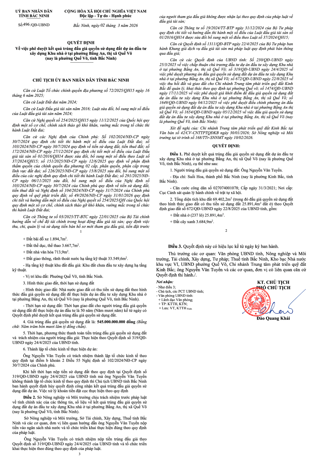 Quyết định số 496/QĐ-UBND do Phó Chủ tịch UBND tỉnh Bắc Ninh Đào Quang Khải ký ngày 02/03/2026.