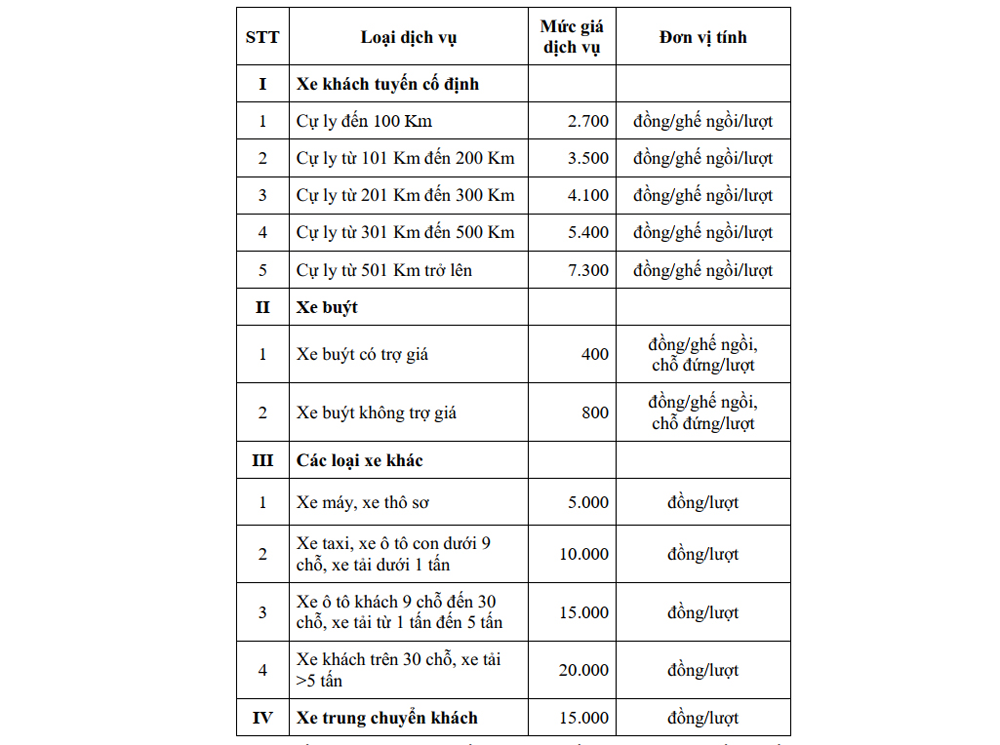 Đối với loại xe buýt, xe trung chuyển khách và các loại xe khác được áp dụng chung cho tất cả các loại bến xe.