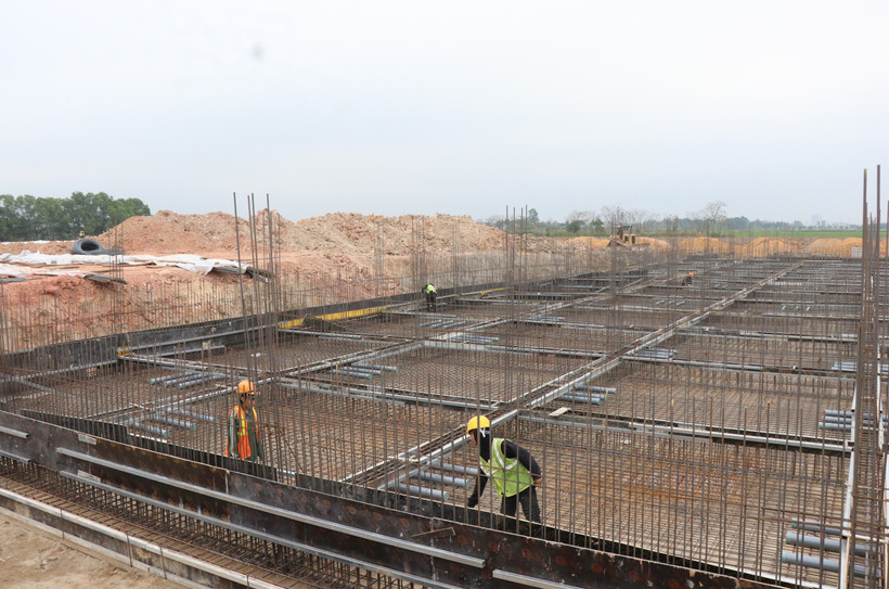Nhà thầu thi công hạng mục bể nước phòng cháy chữa cháy tại Khu công nghiệp Song Mai-Nghĩa Trung, tỉnh Bắc Ninh. (Ảnh: Thanh Thương/TTXVN)