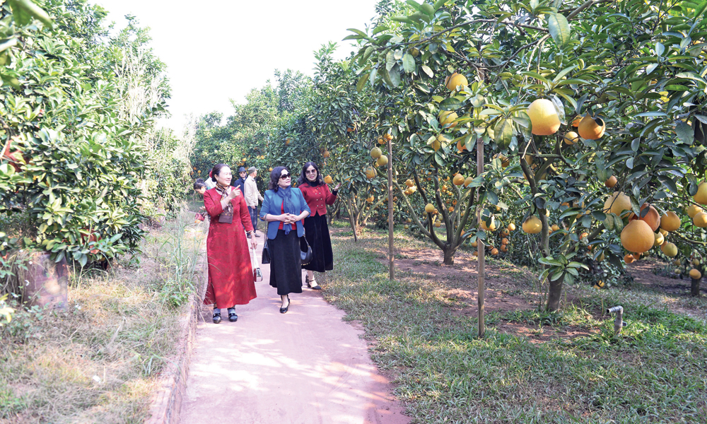 Khách du lịch thăm vườn bưởi của gia đình ông Nguyễn Văn Hữu ở phường Chũ.