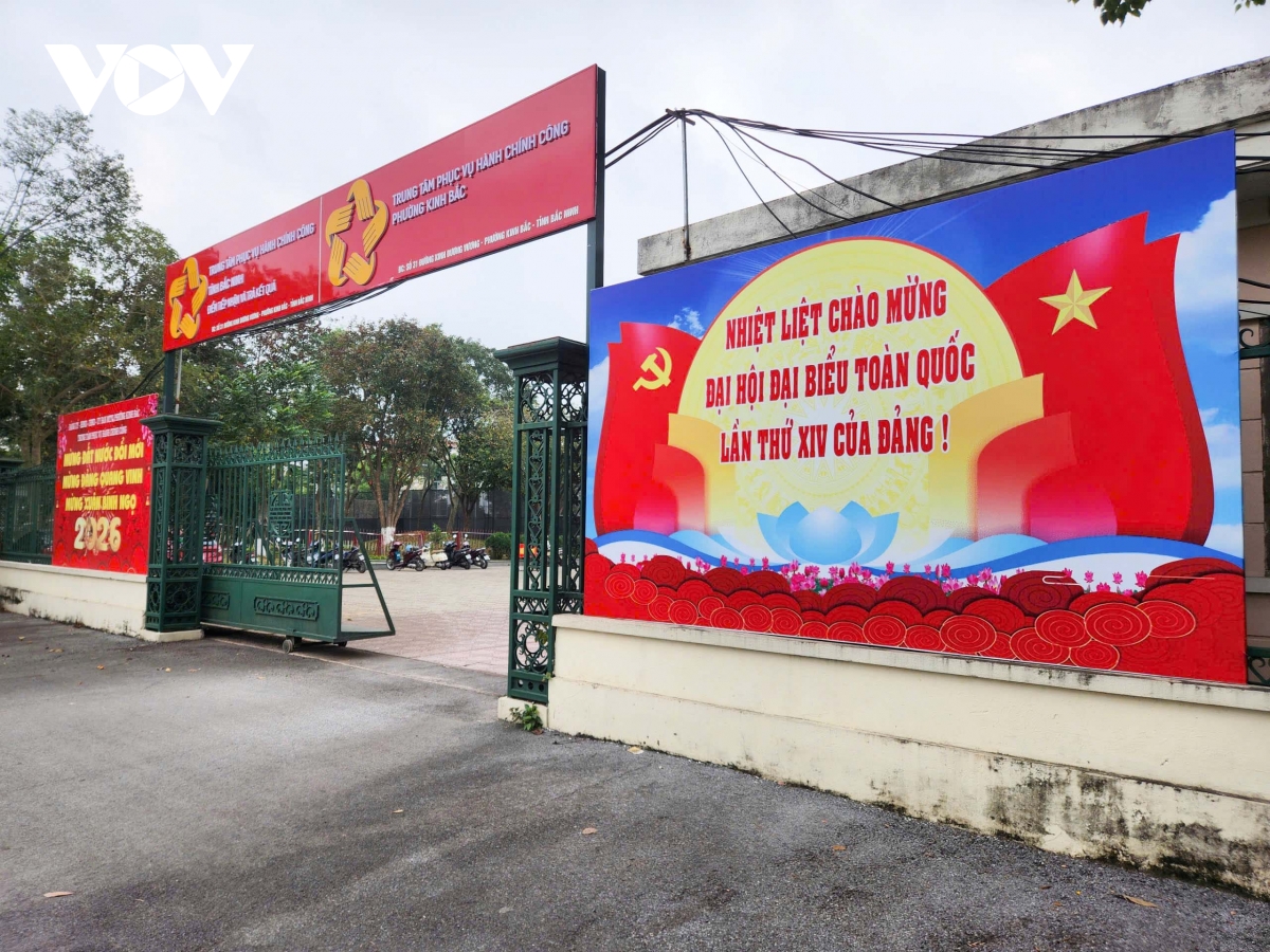 Pano tuyên truyền với khẩu hiệu “Nhiệt liệt chào mừng Đại hội Đại biểu toàn quốc lần thứ XIV của Đảng” tại trụ sở Trung tâm hành chính công phường Kinh Bắc.