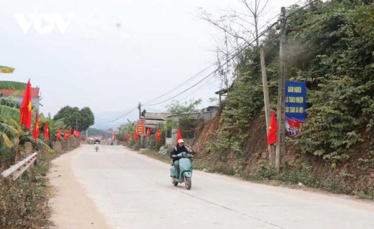 Cờ được cắm dọc các tuyến đường chính của xã vùng cao Tân Sơn, tỉnh Bắc Ninh.