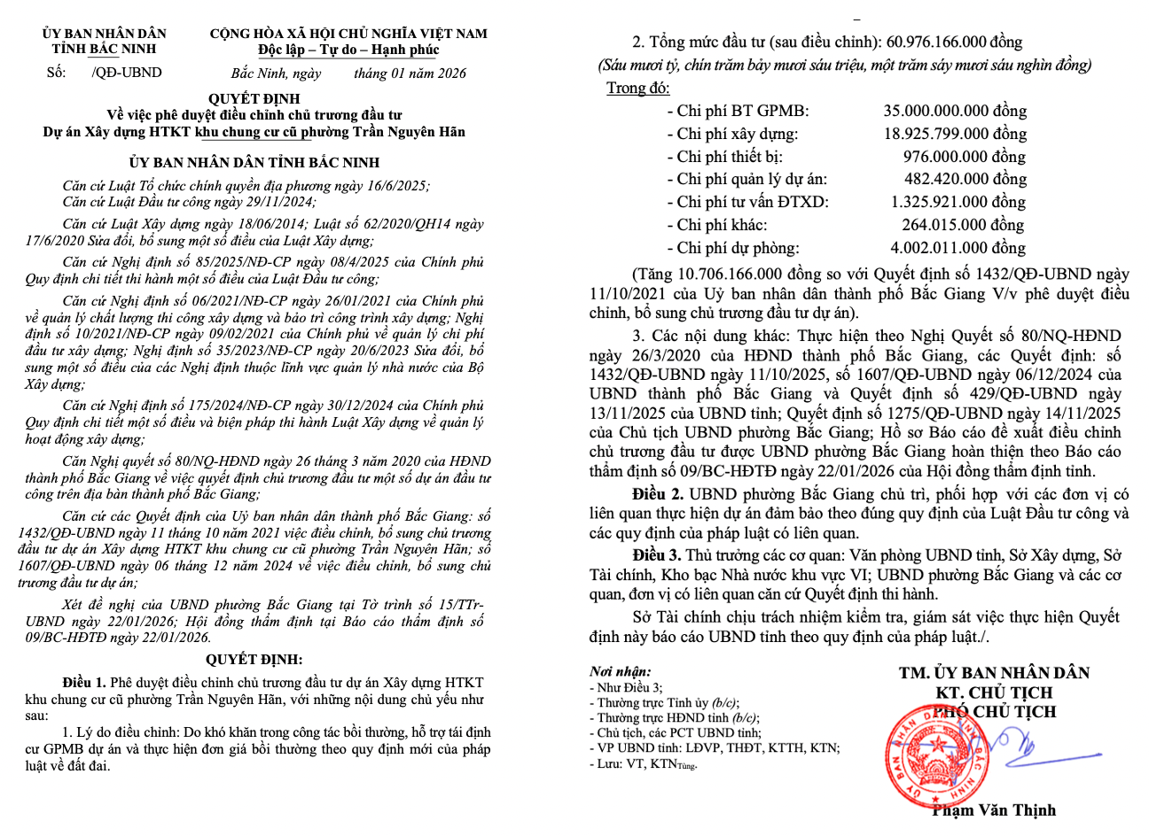 Theo Quyết định, việc điều chỉnh được thực hiện trên cơ sở nhiều căn cứ pháp lý quan trọng như Luật Đầu tư công năm 2024, Luật Xây dựng (sửa đổi, bổ sung), cùng các nghị định hướng dẫn thi hành về quản lý chi phí, chất lượng công trình và hoạt động đầu tư xây dựng. Đồng thời, UBND tỉnh cũng xem xét đề nghị của UBND phường Bắc Giang và báo cáo thẩm định của Hội đồng thẩm định tỉnh trước khi thống nhất phương án điều chỉnh dự án.