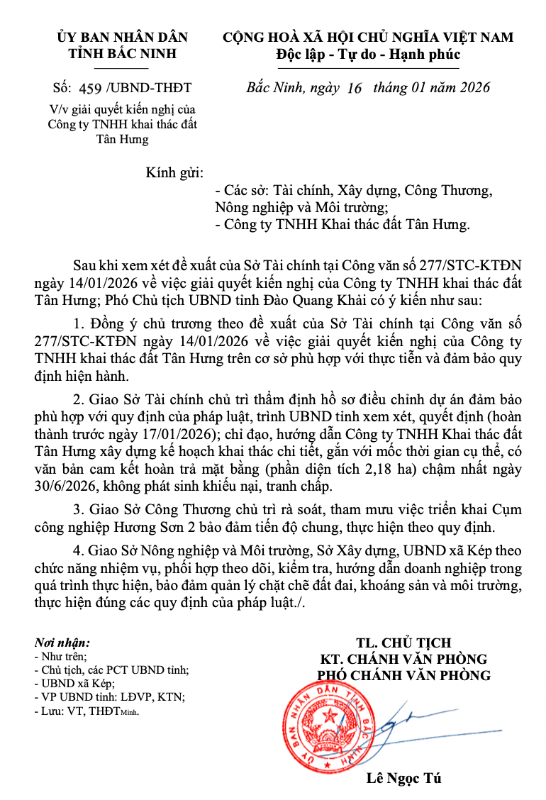 Cụ thể, UBND tỉnh Bắc Ninh giao Sở Tài chính chủ trì thẩm định hồ sơ điều chỉnh dự án của Công ty TNHH Khai thác đất Tân Hưng, đảm bảo phù hợp với quy định của pháp luật, trình UBND tỉnh xem xét, quyết định trước ngày 17/01/2026.