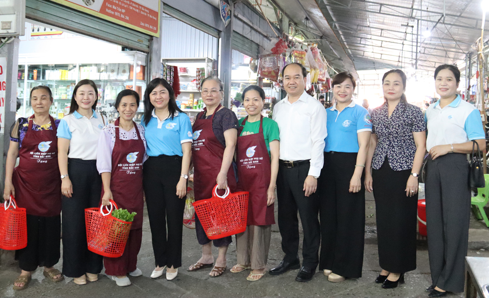 Nhân dịp này, Hội Liên hiệp Phụ nữ tỉnh trao tặng tạp dề cho cán bộ, hội viên phụ nữ và tiểu thương tại chợ Dĩnh Kế (phường Bắc Giang).