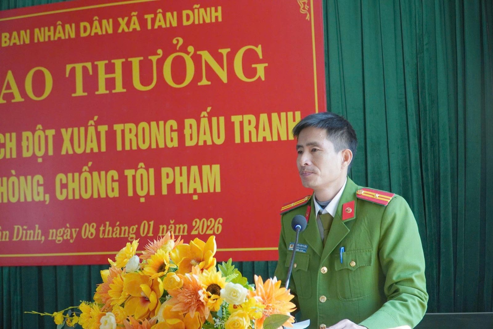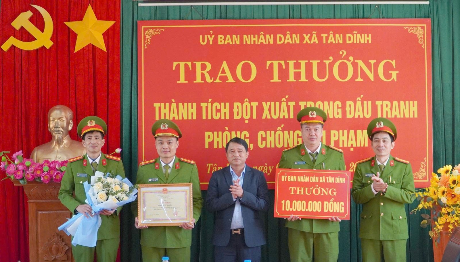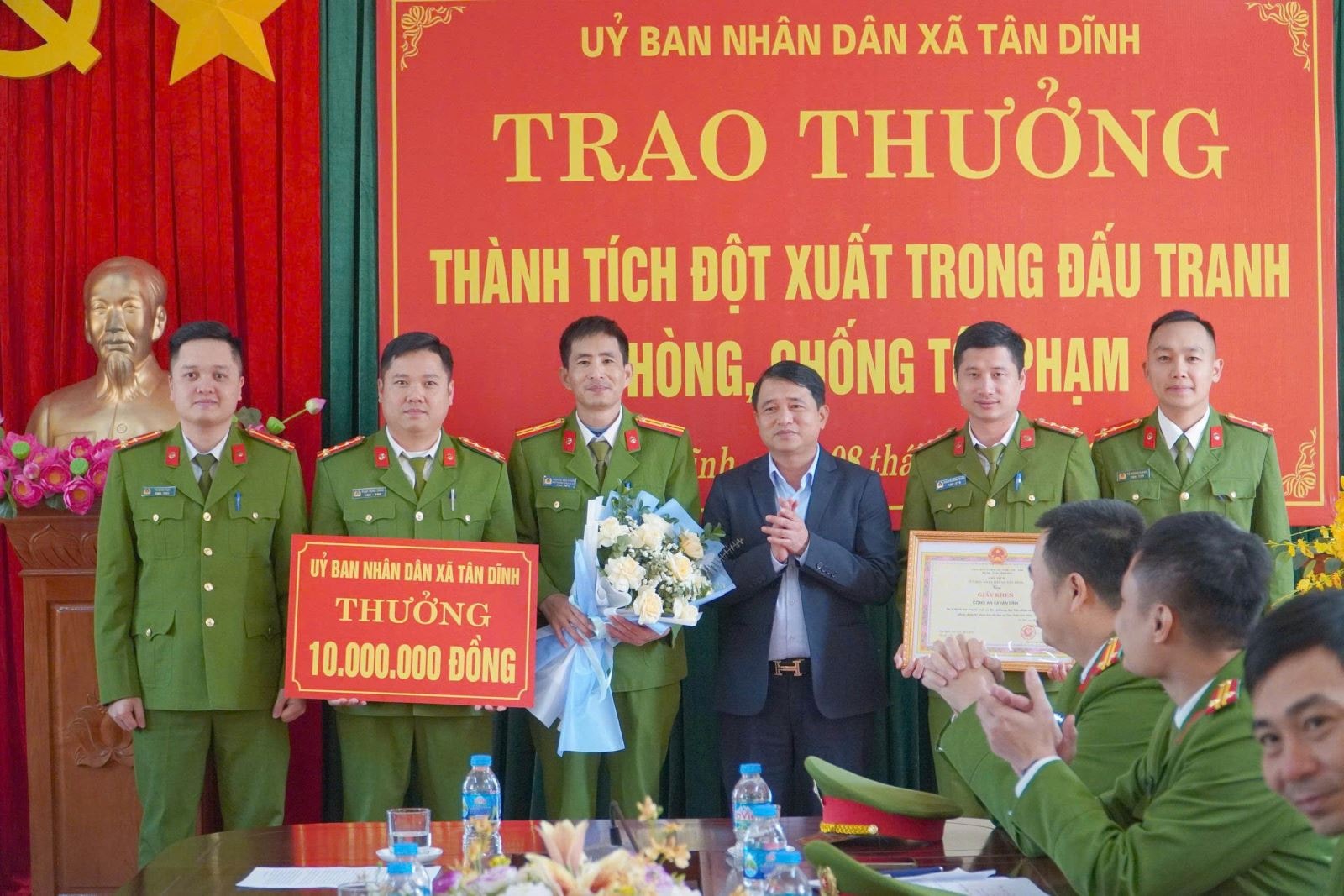 Nhằm kịp thời ghi nhận, biểu dương những thành tích xuất sắc đó, sáng ngày 08/01/2026, UBND xã Tân Dĩnh đã tổ chức khen thưởng đột xuất đối với tập thể Công an xã. Dự buổi khen thưởng có đồng chí Nguyễn Văn Minh – Chủ tịch UBND xã, đại diện các phòng chuyên môn thuộc UBND xã cùng các đồng chí chỉ huy và toàn thể cán bộ, chiến sĩ Công an xã Tân Dĩnh.