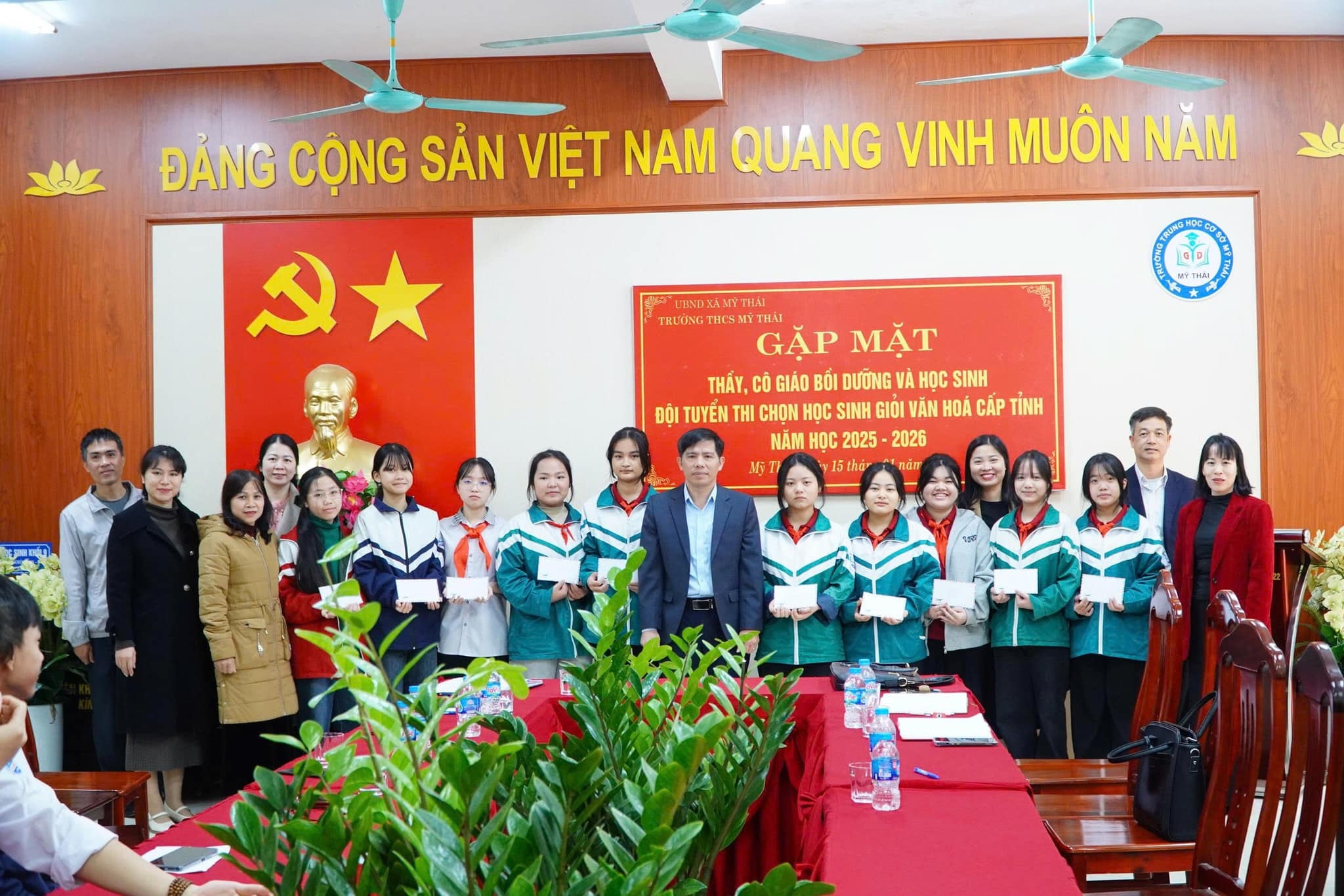 Lãnh đạo UBND xã Mỹ Thái, Phòng Văn hóa - Xã hội cùng Ban Giám hiệu các trường THCS chụp ảnh lưu niệm và trao quà động viên đội tuyển học sinh giỏi văn hóa cấp tỉnh năm học 2025 – 2026.