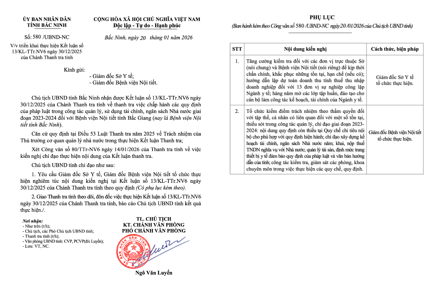 Cụ thể, Chủ tịch UBND tỉnh Bắc Ninh yêu cầu Giám đốc Sở Y tế và Giám đốc Bệnh viện Nội tiết tổ chức thực hiện nghiêm túc nội dung kiến nghị tại Kết luận số 13/KL-TTr.NV6 ngày 30/12/2025 của Chánh Thanh tra tỉnh theo quy định.