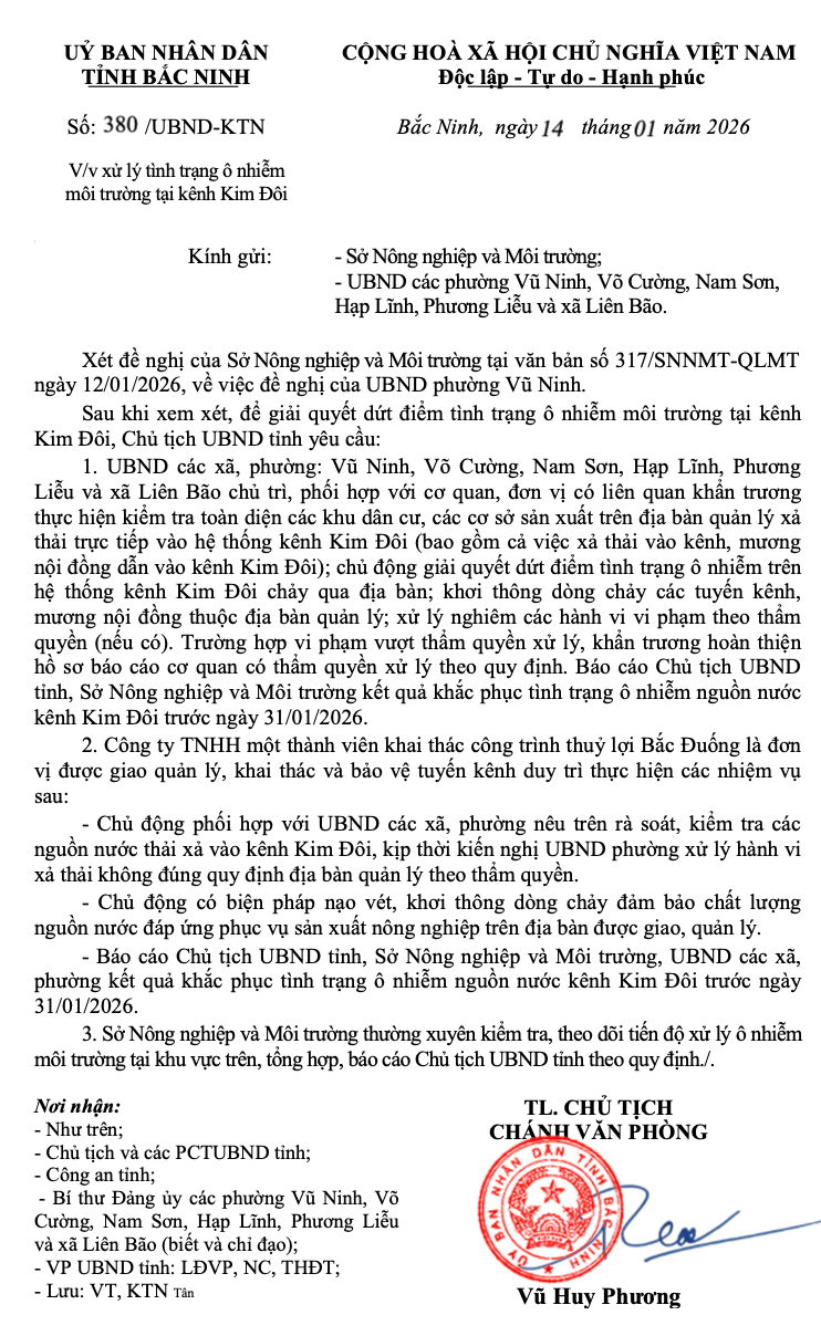 Theo văn bản của UBND tỉnh Bắc Ninh, xét đề nghị của Sở Nông nghiệp và Môi trường tại văn bản số 317/SNNMT-QLMT ngày 12/01/2026, về việc đề nghị của UBND phường Vũ Ninh. Sau khi xem xét, để giải quyết dứt điểm tình trạng ô nhiễm môi trường tại kênh Kim Đôi, Chủ tịch UBND tỉnh Bắc Ninh yêu cầu các đơn vị liên quan tập trung xử lý dứt điểm, không để tình trạng ô nhiễm kéo dài.