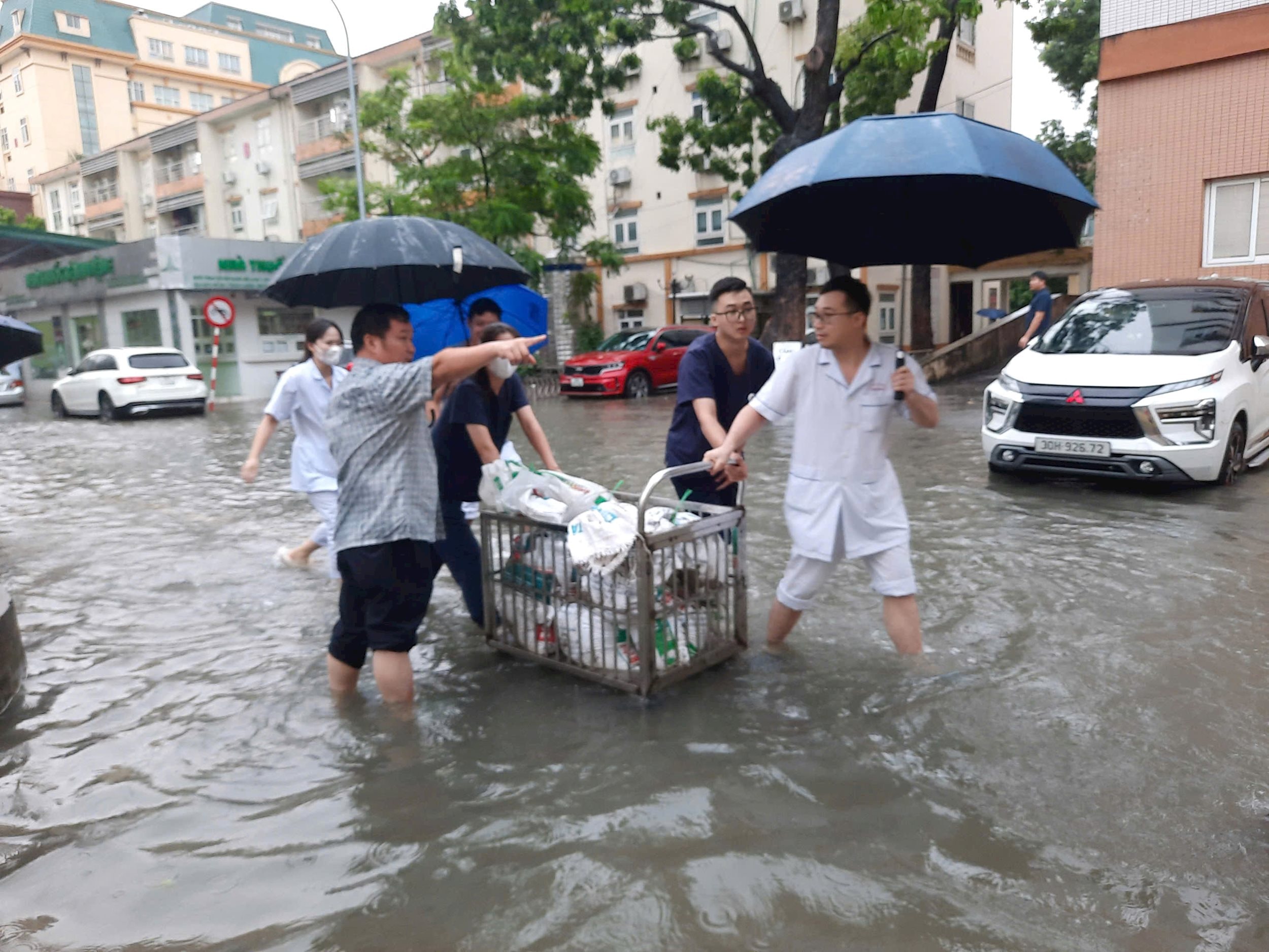 Bệnh viện E triển khai biện pháp phòng chống ngập lụt. Ảnh: BVCC