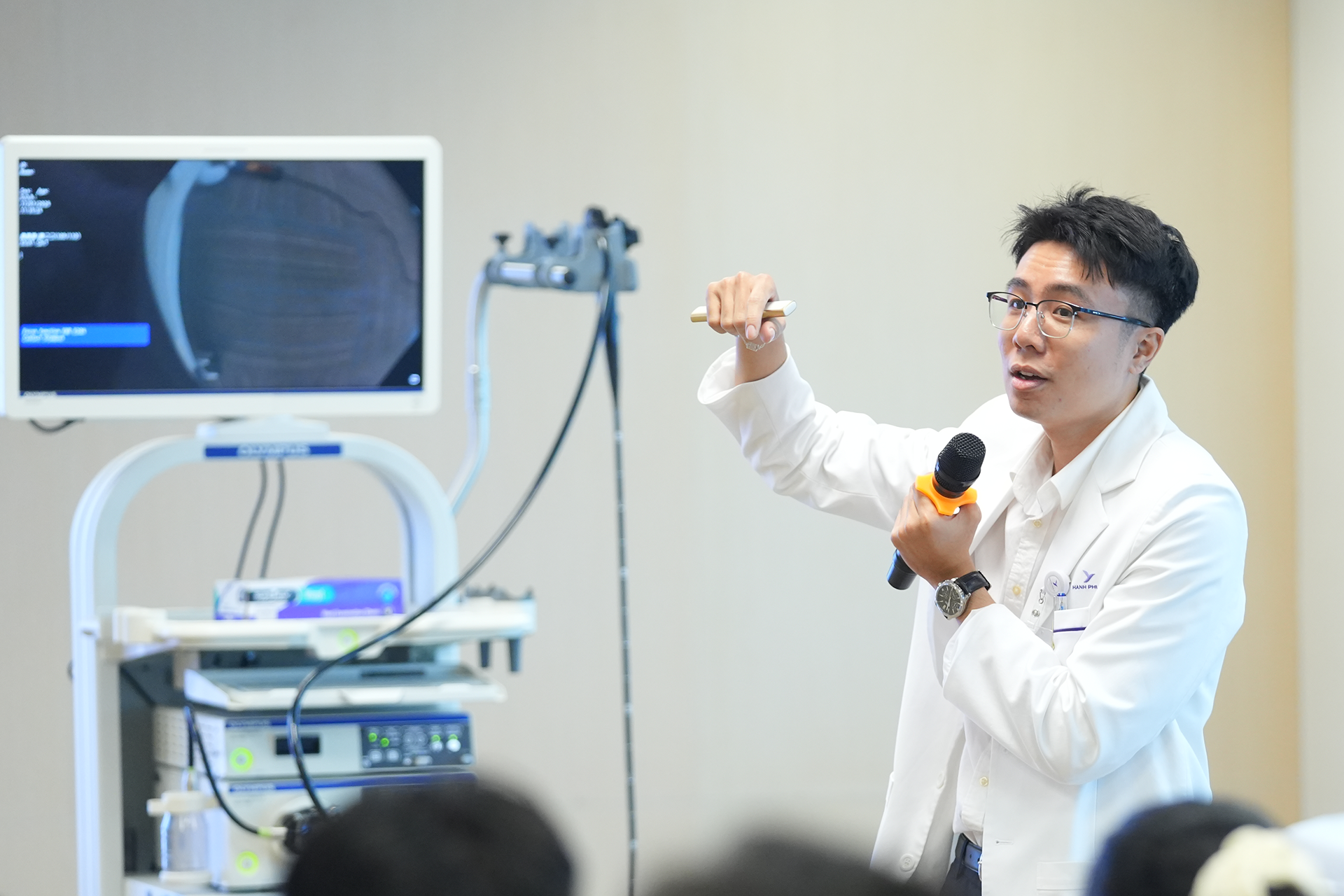 Bác sĩ Vinh đang thực hiện mô hình nội soi dạ dày tại hội thảo. Ảnh: BTC