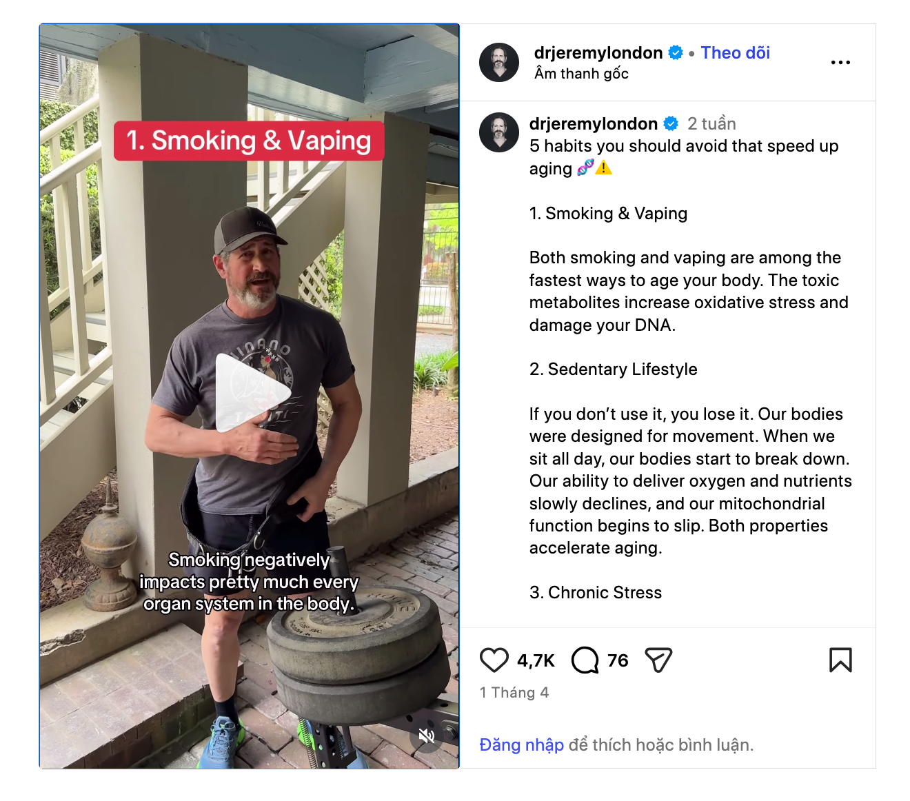 Bác sĩ phẫu thuật tim mạch Jeremy London (Mỹ) đã chia sẻ trên Instagram danh sách 5 thói quen phổ biến có thể khiến cơ thể lão hóa nhanh hơn bình thường