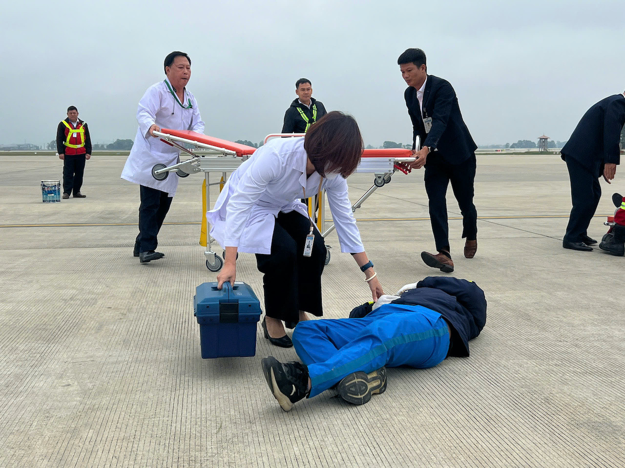 Các bác sĩ diễn tập xử lý tình huống hành khách gặp sự cố về sức khỏe trên các chuyến bay. Ảnh: Phan Công