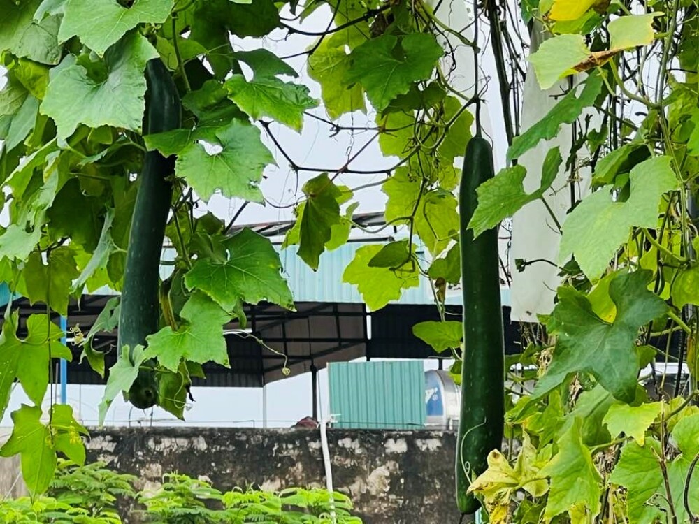 Và mọi vất vả dường như tan biến khi ngắm nhìn khu vườn tràn ngập sức sống. Rau muống, rau lang, rau dền, cải thảo, cần tây, xà lách… mọc xanh rờn; cà chua, dưa chuột, bí, khổ qua,… leo giàn trĩu quả. Ngoài ra, cô còn trồng nhiều loại cây ăn quả như nho xanh, khế, sung,… xen kẽ những khóm hoa nở rực rỡ như hoa trà my, hoa lan, hoa giấy,… Tất cả hòa quyện thành một mảng xanh đầy sức sống giữa lòng phố.