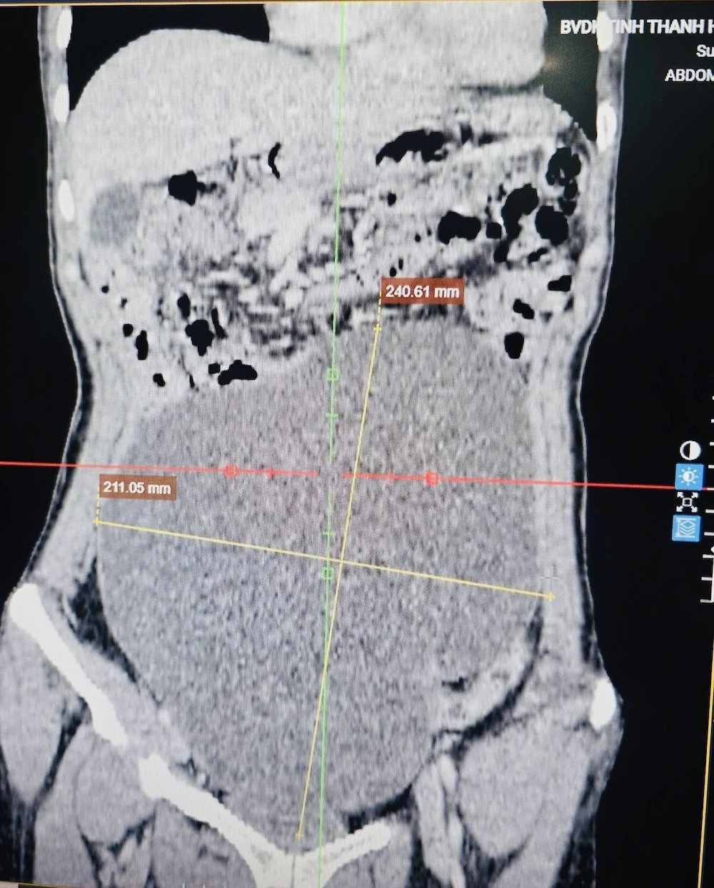 Bệnh nhân đã được các bác sĩ thăm khám lâm sàng và thực hiện các xét nghiệm cận lâm sàng cần thiết. Kết quả chụp cắt lớp vi tính (CLVT) ổ bụng cho thấy một khối u kích thước rất lớn, chiếm gần toàn bộ ổ bụng, kéo dài từ hạ vị đến thượng vị, xuất phát từ buồng trứng, theo dõi u buồng trứng ác tính.