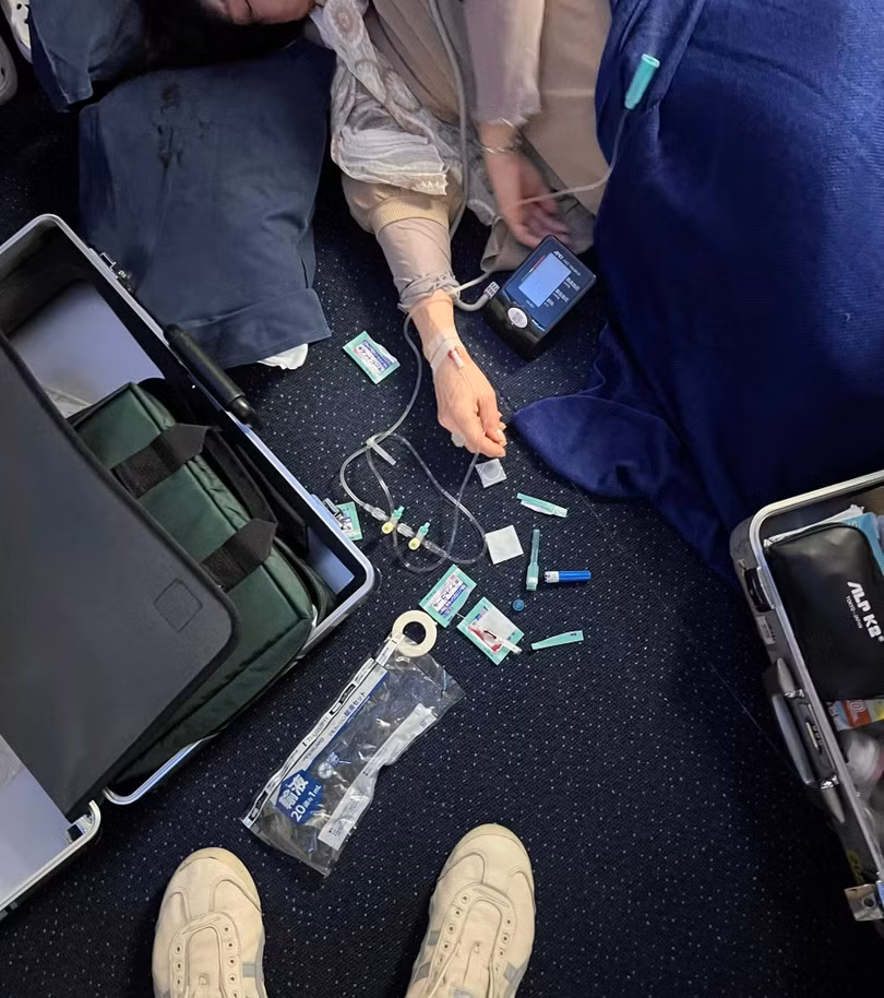 Nhận định bệnh nhân bị tụt huyết áp, anh đề nghị tiếp viên mang bộ cấp cứu y tế ra. “Tôi thấy trong đó có dịch truyền Normal Saline và kim luồn nên đề nghị mở ra để dùng ngay”, anh kể. Khi đó, mạch bệnh nhân đã xuống rất thấp.