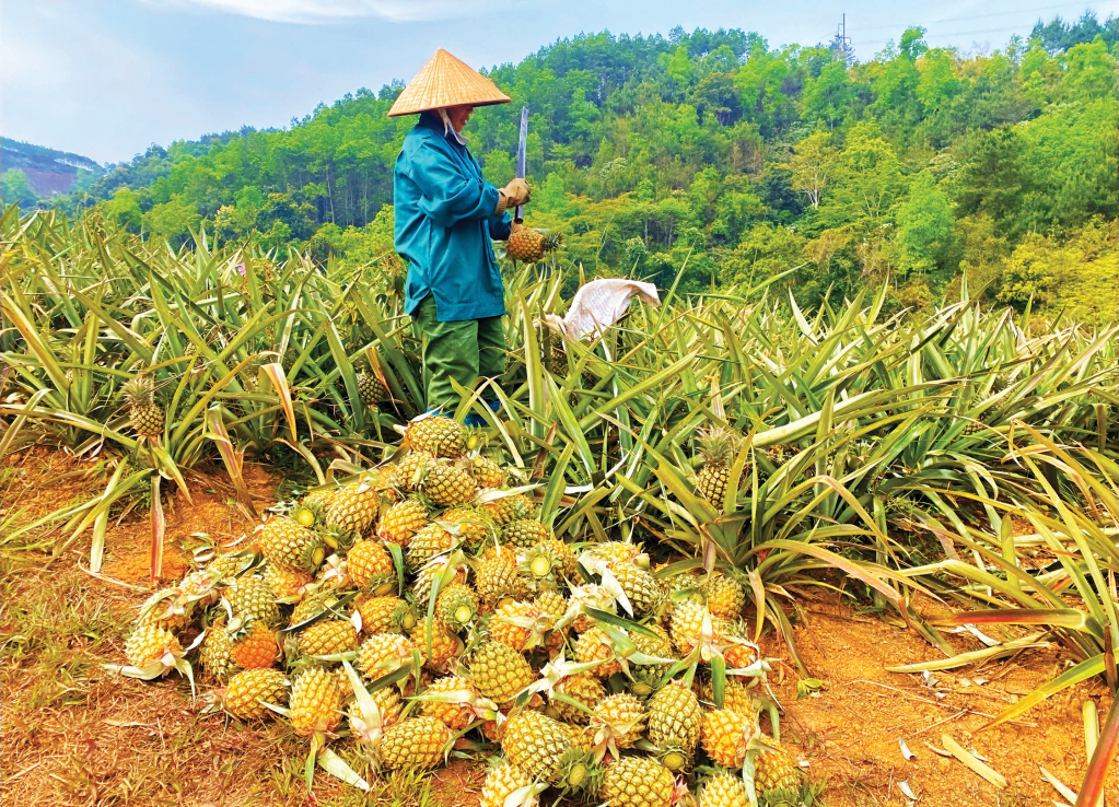 Nhiều hộ gắn bó với cây dứa đã chủ động trong sản xuất và tiêu thụ sản phẩm. Gia đình chị Triệu Thị Hương, xóm Bản Sẳng với hơn 20 năm kinh nghiệm trồng dứa, phấn khởi: Gia đình tôi duy trì trồng 1 ha dứa, mỗi năm đều thu hơn 100 triệu đồng. Đặc biệt, việc tận dụng các kênh bán hàng trực tuyến đã giúp sản phẩm dứa địa phương vươn xa hơn. Dứa được khách hàng đặt mua qua mạng, vận chuyển qua xe khách và thanh toán linh hoạt qua tài khoản, góp phần mở rộng thị trường tiêu thụ. Hiện giá dứa đầu vụ bán sỉ 15 nghìn đồng/quả và bán lẻ là 20 nghìn đồng/quả. Từ cây dứa, gia đình có điều kiện sửa sang nhà cửa, cuộc sống ổn định hơn rất nhiều.