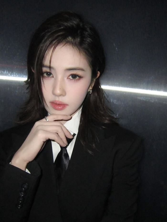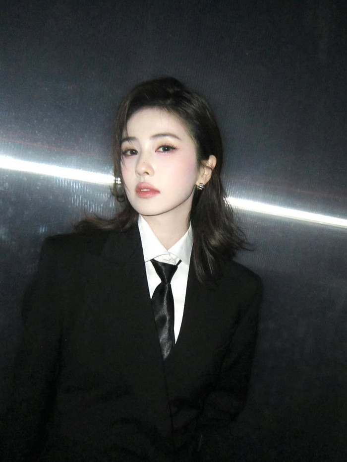 Nữ diễn viên diện bộ vest đen phom rộng, được cắt may gọn gàng, tạo cảm giác mạnh mẽ và trung tính. Bên trong, cô kết hợp áo sơ mi trắng cổ đứng cùng cà vạt đen bản nhỏ, giúp tổng thể trang phục thêm phần chỉn chu và mang hơi hướng menswear rõ nét.