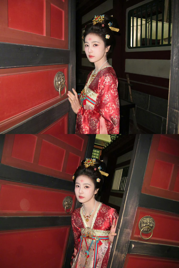 Phần cổ áo viền hoa văn ánh kim cùng chuỗi trang sức trước ngực giúp tổng thể trở nên sang trọng, gợi cảm giác quyền quý của một nhân vật xuất thân cao quý. Kiểu tóc búi cao cầu kỳ, cài trâm vàng và hoa ngọc, kết hợp lối trang điểm nhấn vào làn da trắng cùng dấu hoa giữa trán, càng làm nổi bật vẻ đẹp kiêu sa, trầm tĩnh của nữ diễn viên.