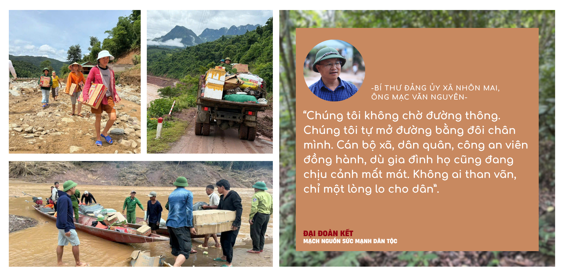 Bí thư Đảng ủy xã Nhôn Mai, ông Mạc Văn Nguyên, cùng cán bộ quyết định mở đường thủ công xuyên rừng, vượt núi để đón hàng cứu trợ từ xã Mỹ Lý. “Đường bộ bị vùi lấp, đá vẫn rơi, nhưng chúng tôi không thể ngồi yên. Phải băng rừng, đi thuyền dọc Nậm Nơn để đưa mì gói, nước uống đến tay dân”, ông Nguyên nhớ lại.