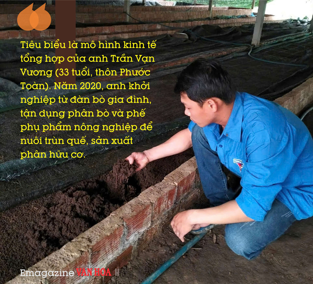 Tiêu biểu là mô hình kinh tế tổng hợp của anh Trần Vạn Vương (33 tuổi, thôn Phước Toàn). Năm 2020, anh khởi nghiệp từ đàn bò gia đình, tận dụng phân bò và phế phụ phẩm nông nghiệp để nuôi trùn quế, sản xuất phân hữu cơ.