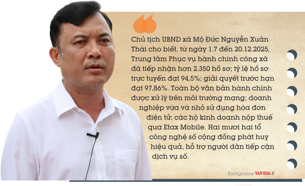 Chủ tịch UBND xã Mộ Đức Nguyễn Xuân Thái cho biết, từ ngày 1.7 đến 20.12.2025, Trung tâm Phục vụ hành chính công xã đã tiếp nhận hơn 2.350 hồ sơ; tỷ lệ hồ sơ trực tuyến đạt 94,5%; giải quyết trước hạn đạt 97,86%. Toàn bộ văn bản hành chính được xử lý trên môi trường mạng; doanh nghiệp vừa và nhỏ sử dụng hóa đơn điện tử; các hộ kinh doanh nộp thuế qua Etax Mobile. 22 tổ công nghệ số cộng đồng phát huy hiệu quả, hỗ trợ người dân tiếp cận dịch vụ số.
