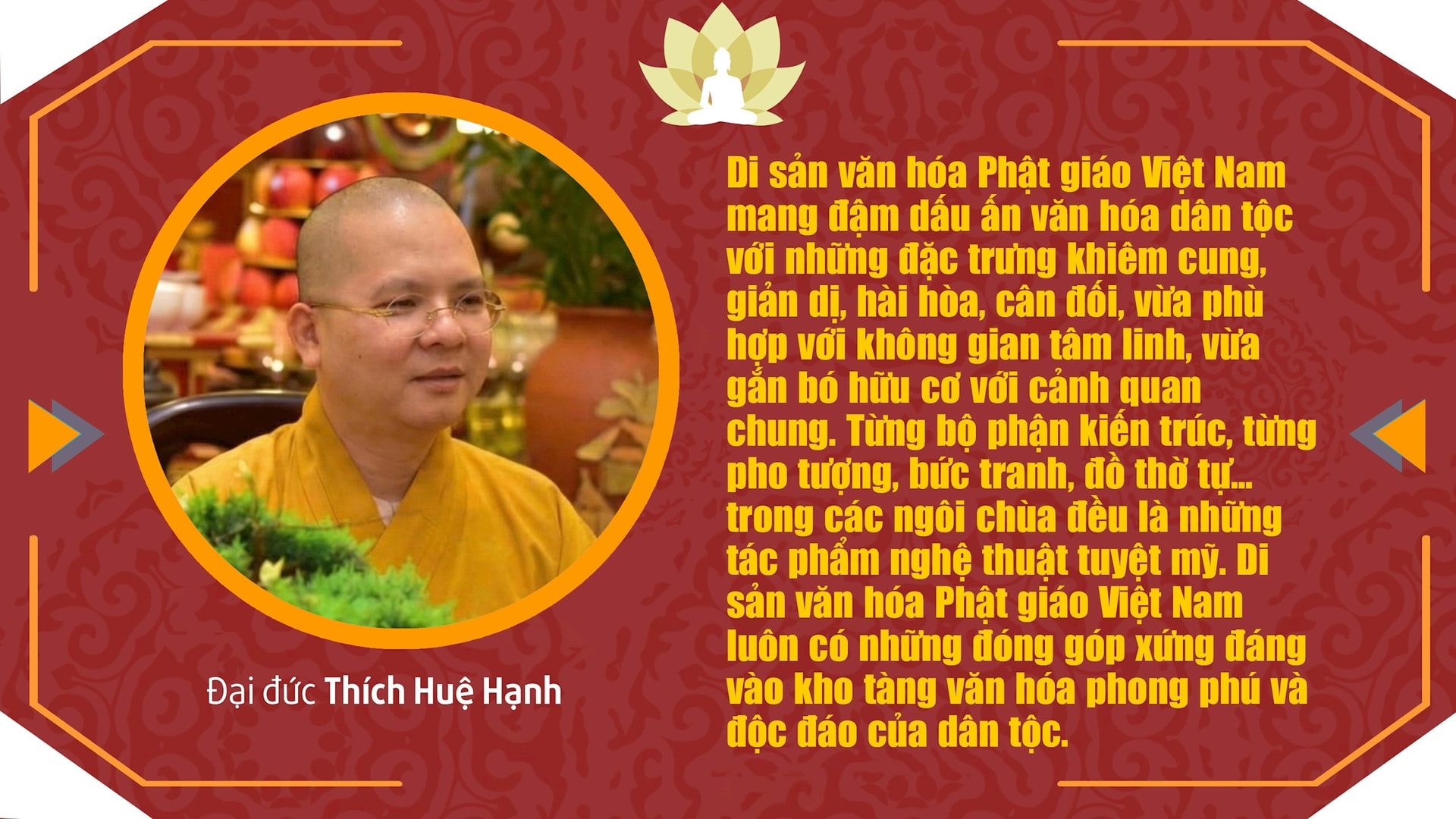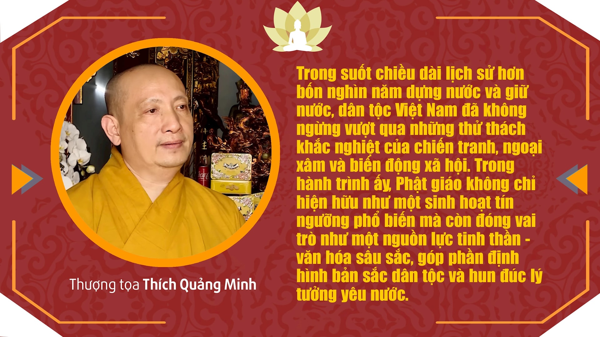 Trong suốt chiều dài lịch sử dựng nước và giữ nước của dân tộc, Phật giáo không chỉ hiện hữu như một sinh hoạt tín ngưỡng, mà còn đóng vai trò là nguồn lực tinh thần góp phần định hình bản sắc dân tộc, xây dựng đạo đức xã hội. Đồng thời, Phật giáo hun đúc lý tưởng yêu nước, tinh thần nhân văn trong mỗi con người Việt Nam hướng tới tương lai thịnh vượng, bền vững. Văn hóa Phật giáo cũng thấm sâu vào đời sống, tạo nên những giá trị đặc biệt khơi nguồn sáng tạo cho văn học nghệ thuật.