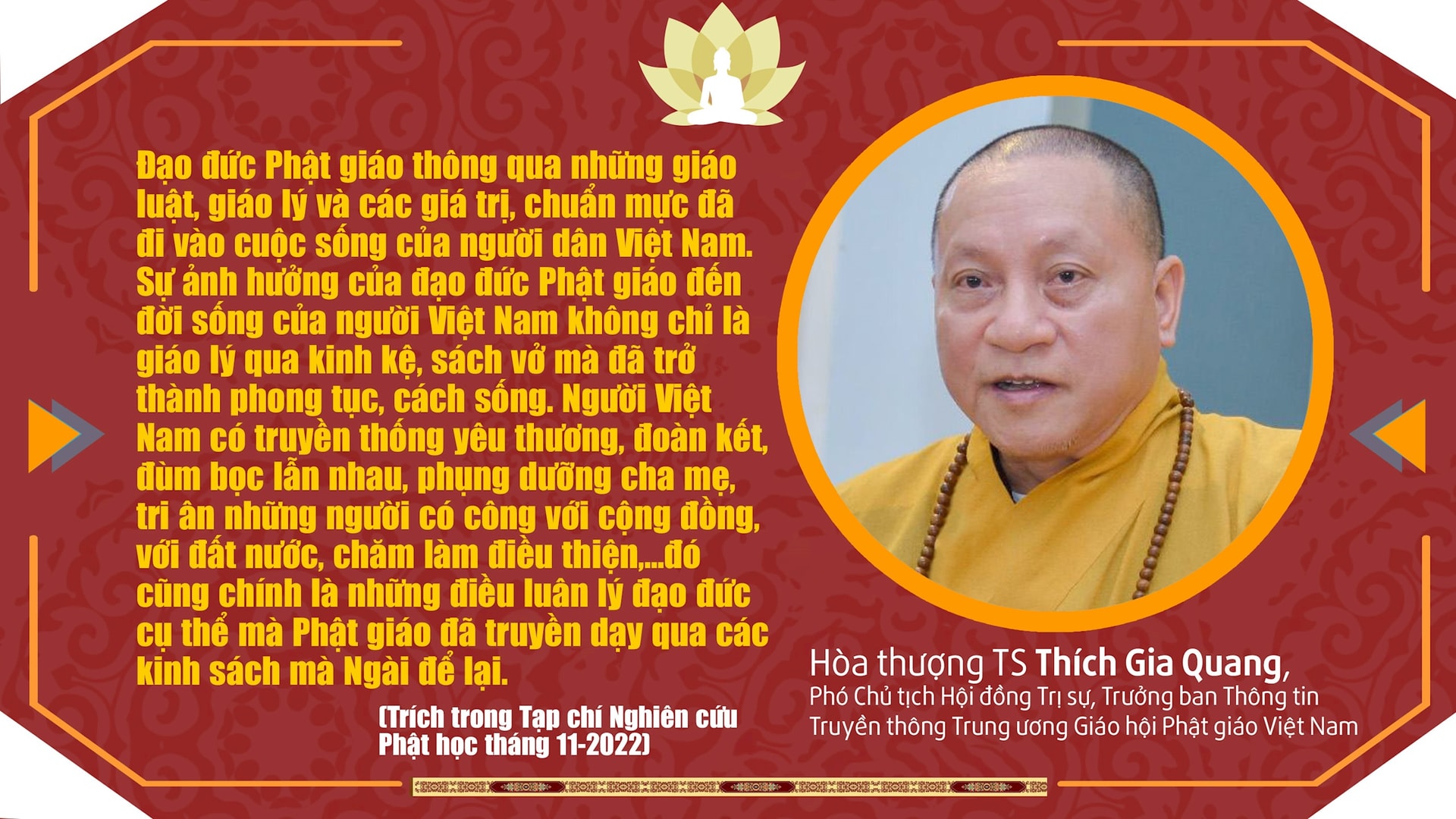 Có thể khẳng định, với hệ giá trị giáo lý giàu tính nhân văn, Phật giáo Việt Nam đã và đang đóng góp thiết thực vào việc xây dựng nền đạo đức xã hội. Và, thực tế đã chứng minh, giáo lý nhà Phật phù hợp với cốt cách dân tộc Việt Nam, là một điểm tựa để xây dựng nền tảng đạo đức xã hội trong thời đại mới trên cơ sở kế thừa những giá trị văn hóa truyền thống của dân tộc.