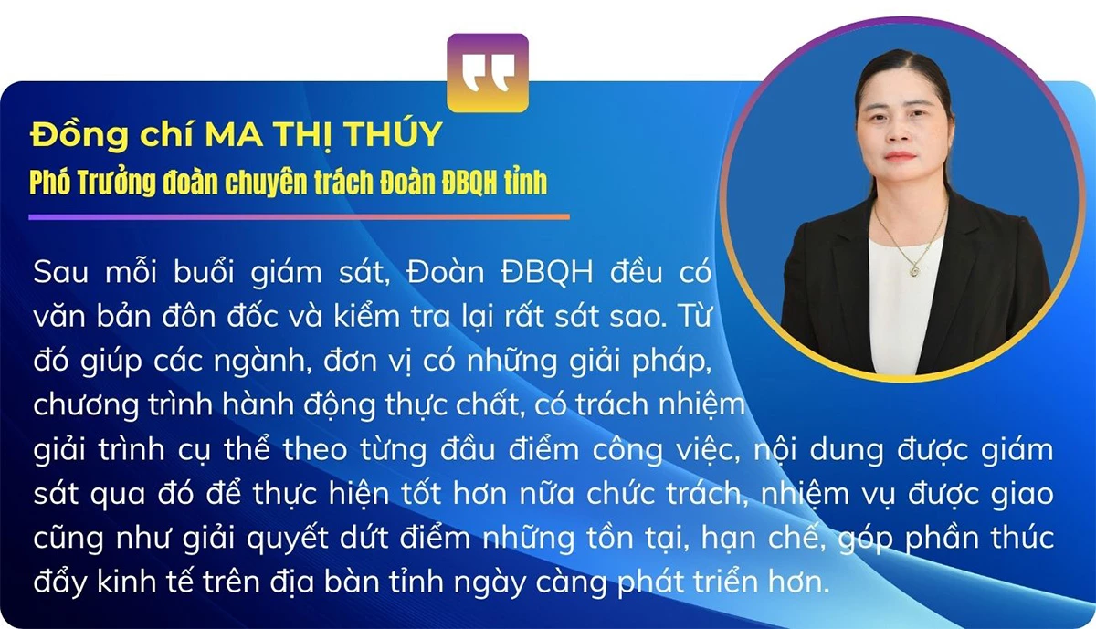 Thông qua các cuộc giám sát và khảo sát chuyên sâu này, Đoàn ĐBQH đã thực hiện hiệu quả vai trò của cơ quan dân cử. Sau mỗi cuộc giám sát, nhiều ý kiến, kiến nghị đã được Đoàn gửi đến Quốc hội, Chính phủ, các Bộ, ngành và UBND tỉnh. Các kiến nghị này không chỉ dừng lại ở việc chỉ ra thiếu sót mà còn mang tính xây dựng, yêu cầu các cơ quan chịu sự giám sát nhìn nhận rõ những vấn đề còn tồn tại, hạn chế để có biện pháp khắc phục kịp thời, từ đó thúc đẩy quá trình điều chỉnh, hoàn thiện cơ chế, chính sách quản lý nhà nước trên địa bàn tỉnh Tuyên Quang.