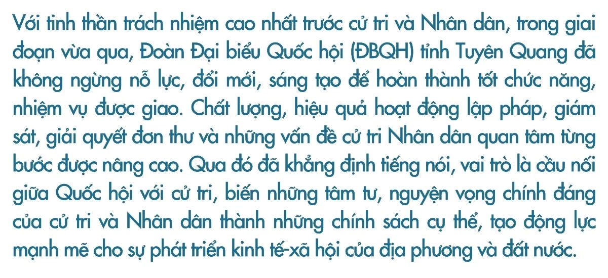 Những kết quả đạt được trong nhiệm kỳ vừa qua đã khẳng định tầm vóc và trách nhiệm của Đoàn ĐBQH tỉnh Tuyên Quang, không chỉ là cơ quan đại diện cho ý chí và nguyện vọng của Nhân dân địa phương mà còn là một đơn vị tiên phong trong việc thực hiện đổi mới theo tinh thần Nghị quyết của Đảng và Quốc hội.