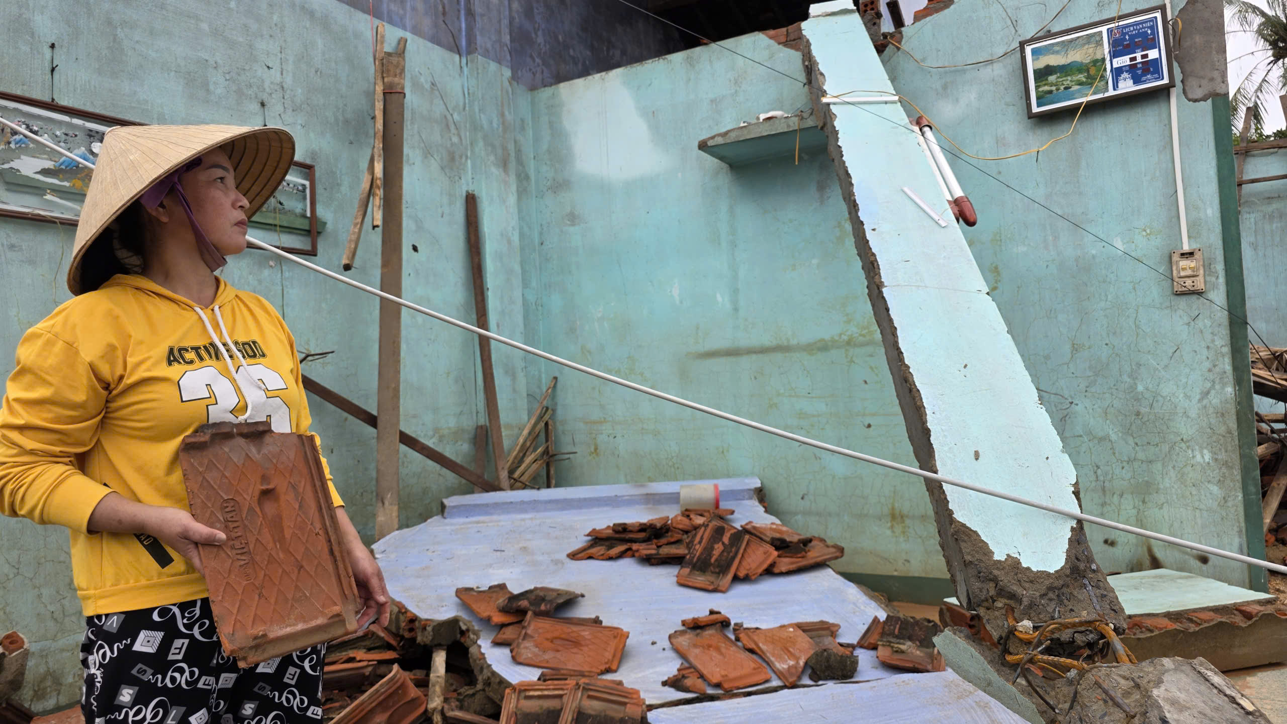 Mái ấm sau nhiều năm xây dựng của chị Nguyễn Thị Trinh (45 tuổi, thôn Thạch Tuân 1) bị đổ sập, gia đình trắng tay sau bão. (Ảnh: Ngọc Hùng).