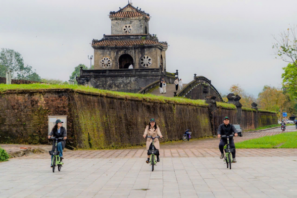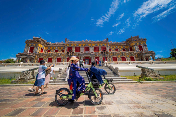 Du khách trải nghiệm xe đạp khi tham quan Hoàng Cung Huế.